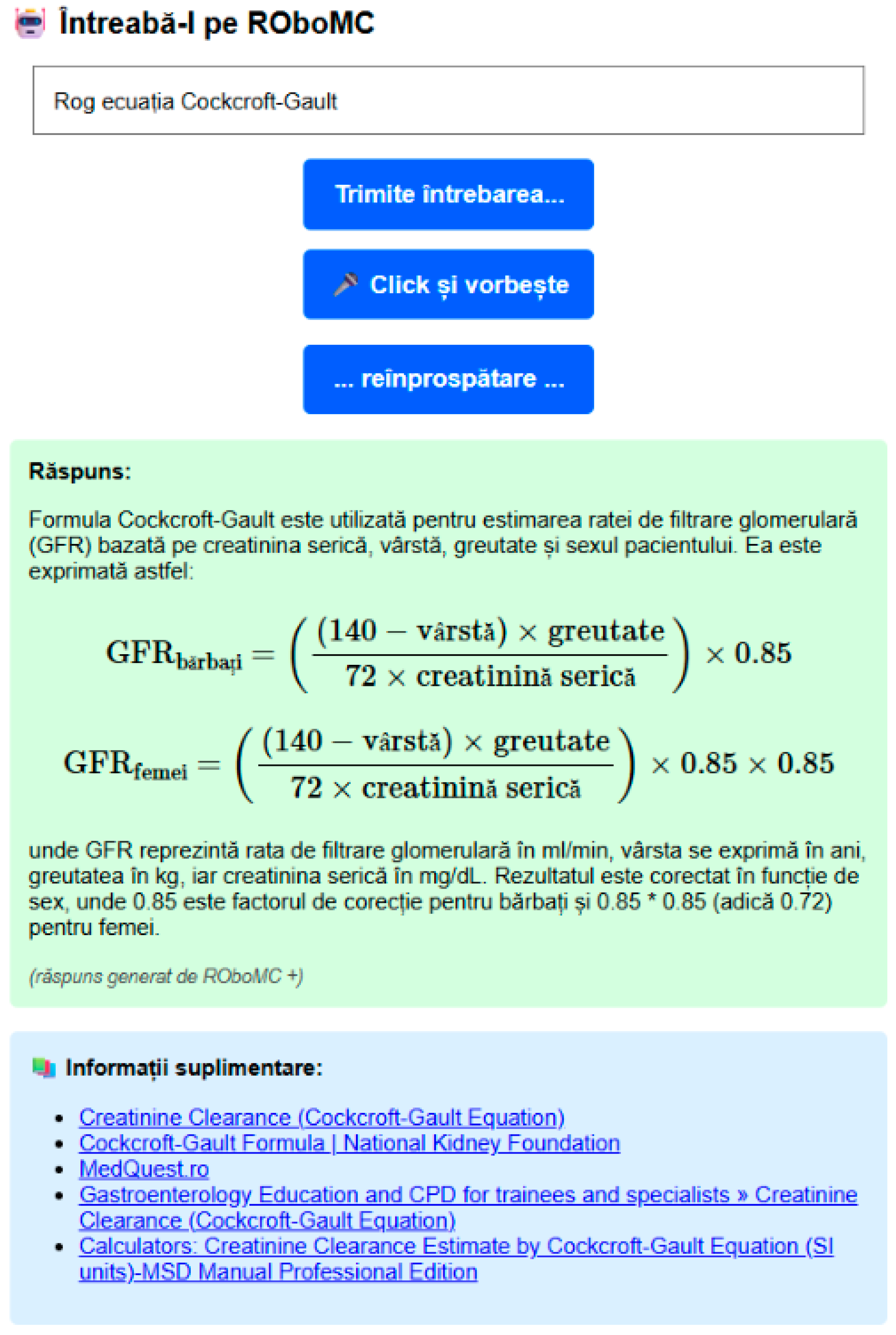 Figure 3. Example of a generated response displaying the complete Cockcroft–Gault equation, illustrating the chatbot’s ability to process and present mathematical formulas. Note: The interface labels appear in Romanian (e.g., “Rog ecuația Cockcroft–Gault”—“Request the Cockcroft–Gault equation”, “Trimitere întrebare”—“Submit question”, “Răspuns”—“Answer”) as they are part of the actual ROboMC application used in testing.