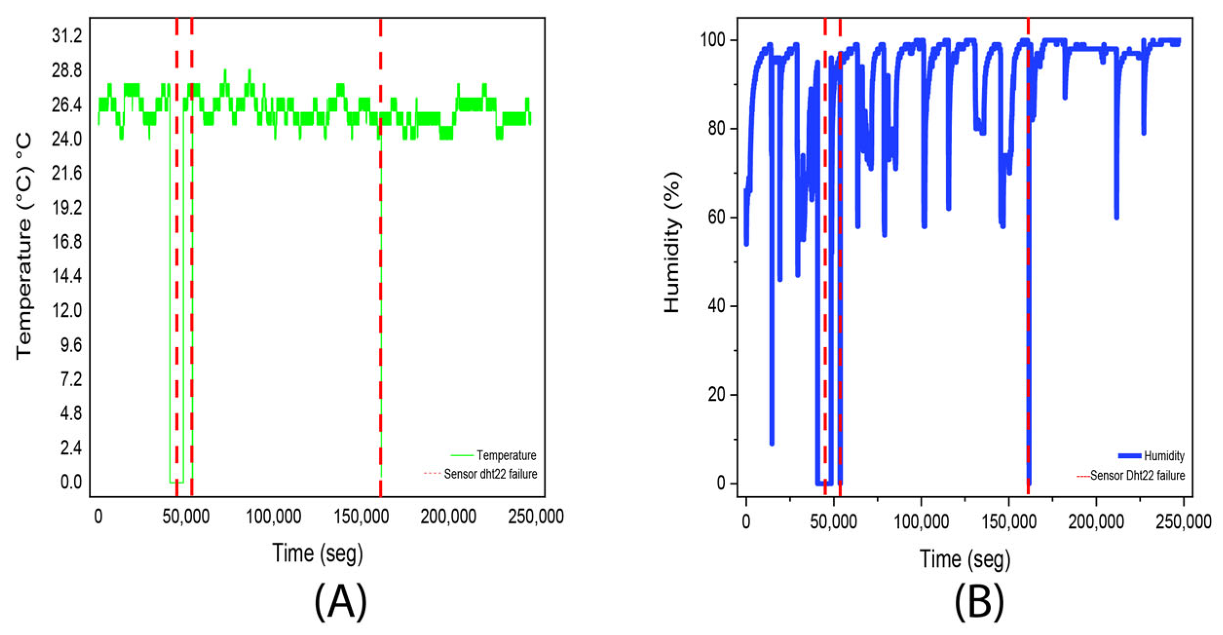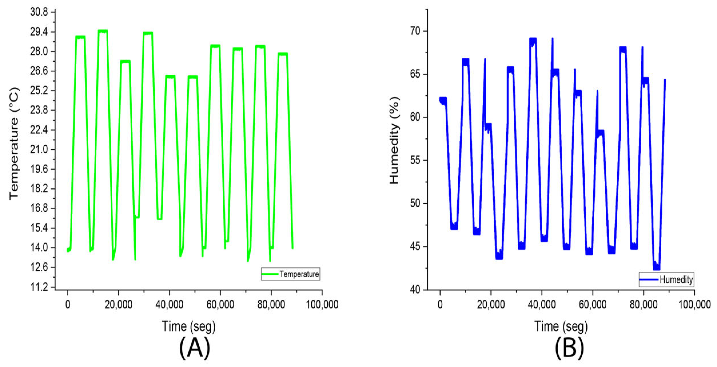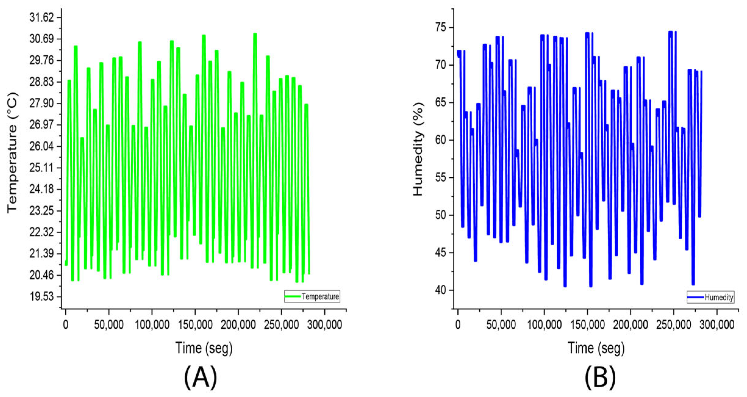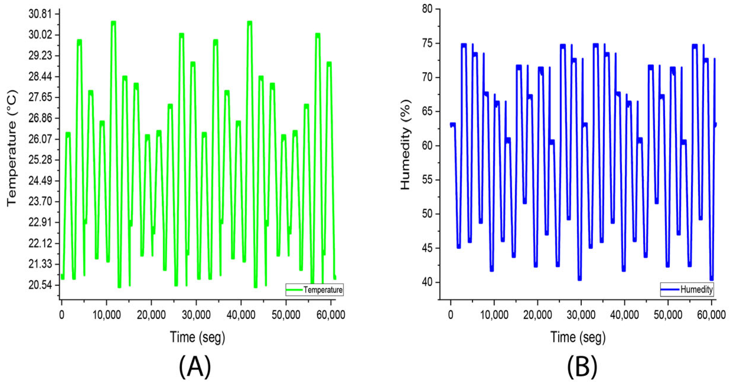 | 1 | DHT22 Sensor (Guangdong, China) | Temperature range: −40 to 80 °C. Humidity range: 0 to 100% RH. Accuracy: Temperature: ±0.5 °C, Humidity: ±2–5% RH. Resolution: Temperature: 0.1 °C, Humidity: 0.1%. Power: 3.3 V to 6 V DC. Communication: Digital |