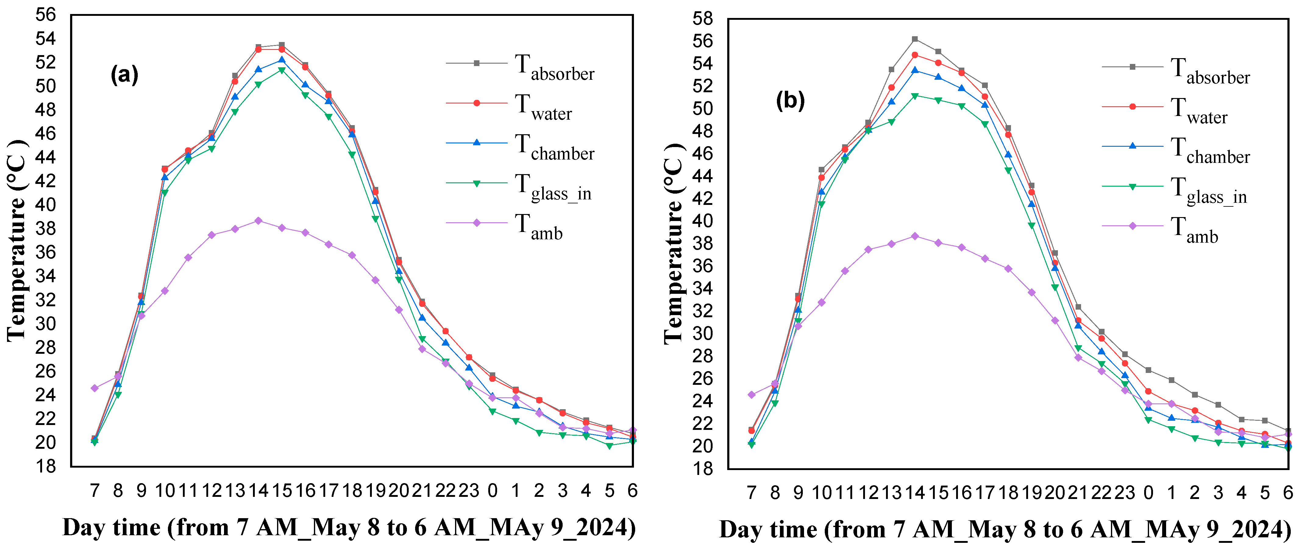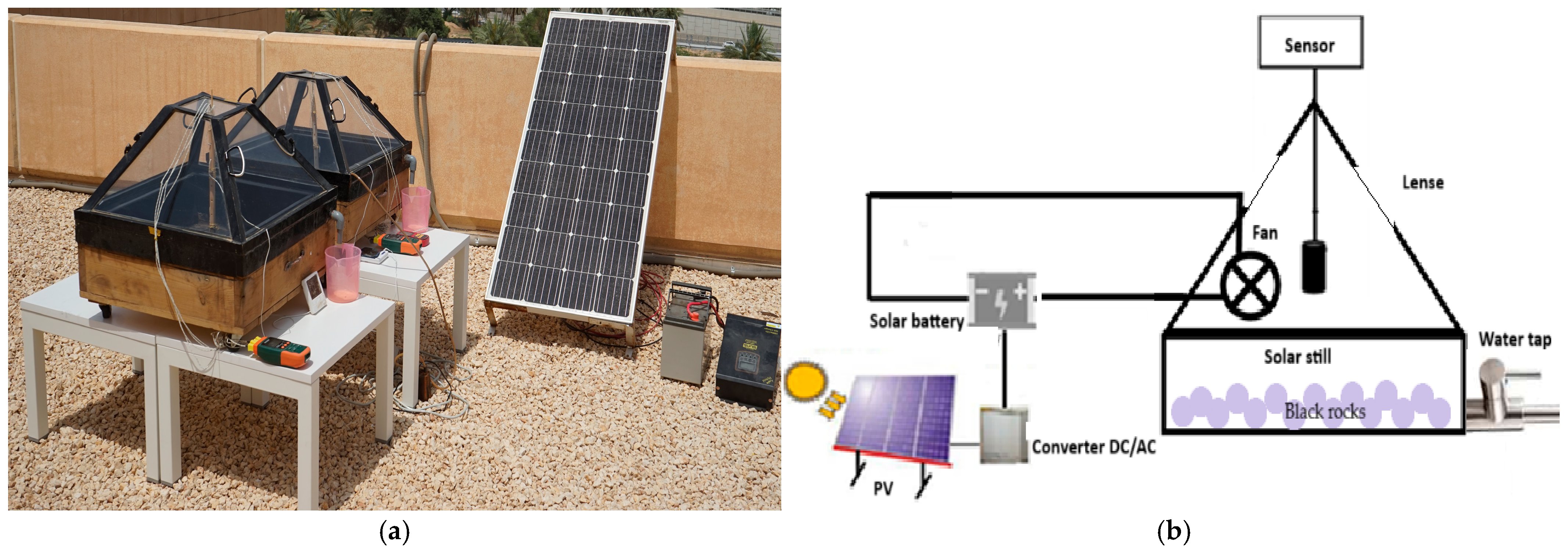 - Ahmed, M.M.; Younes, M.M.; Sharshir, S.W.; Elashmawy, M. The latest advances in solar still desalination systems: Analyzing different geometric configurations. Sol. Energy Mater. Sol. Cells 2025, 286, 113573. [Google Scholar] [CrossRef]