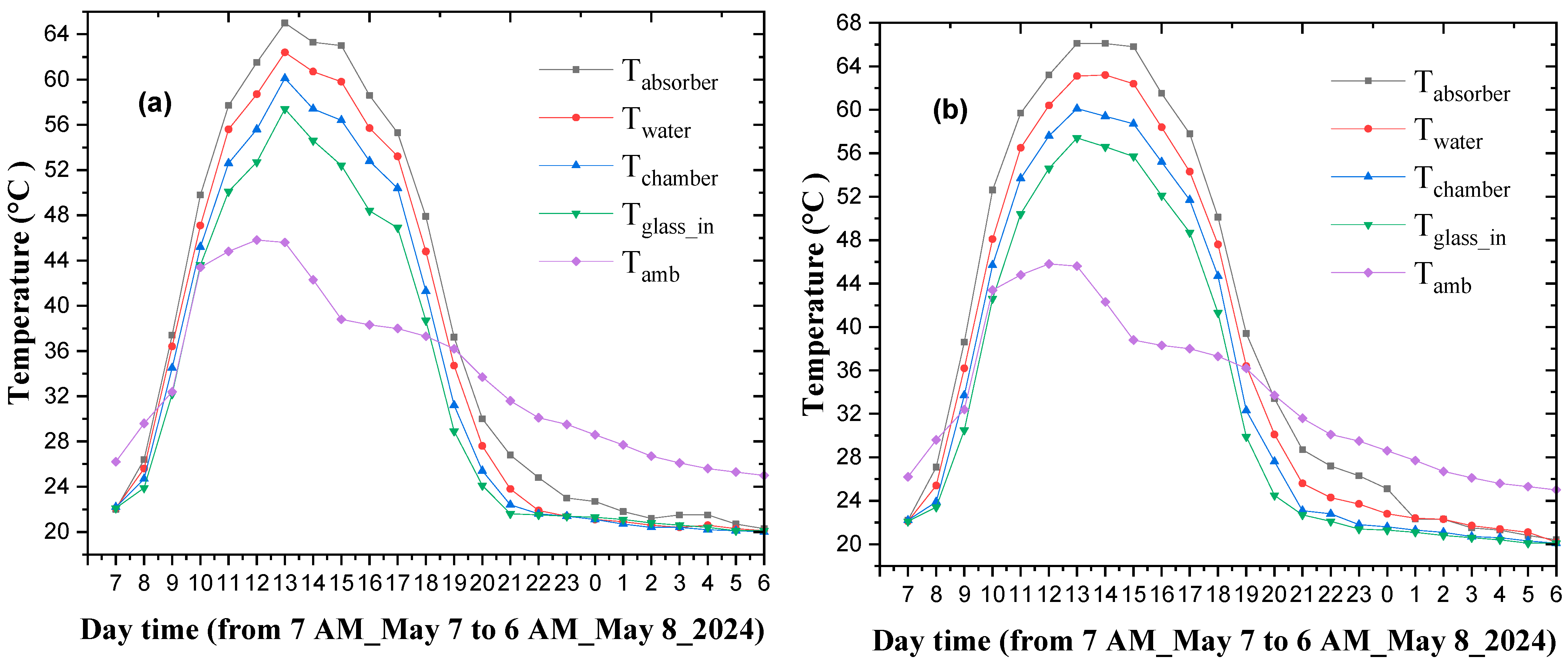 - Kumar, N.; Kumar, A. Performance enhancement of conventional solar still using water depth variation and external reflector: An experimental study with energy, exergy, environ-economic analysis. J. Water Process. Eng. 2024, 68, 106460. [Google Scholar] [CrossRef]