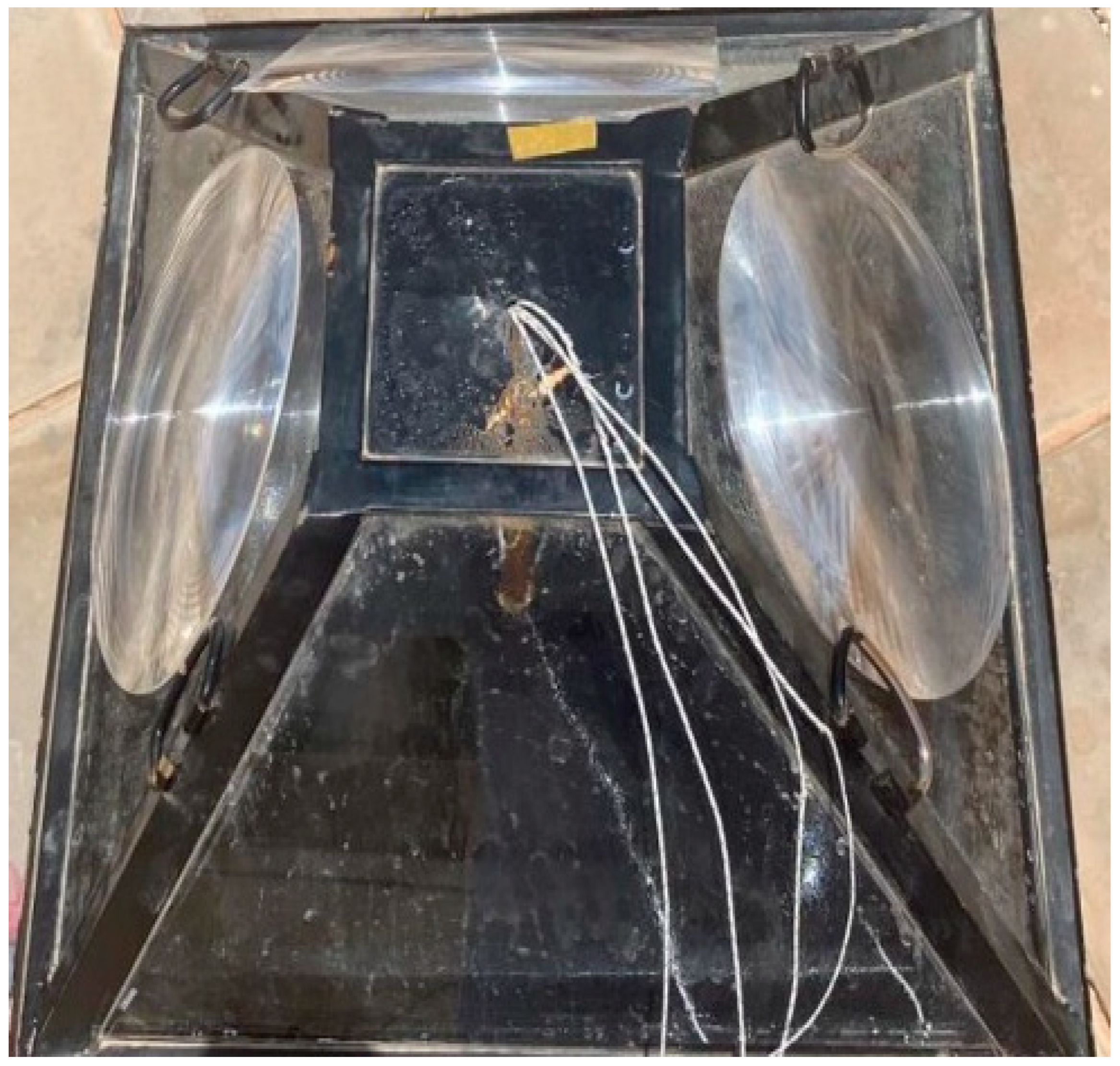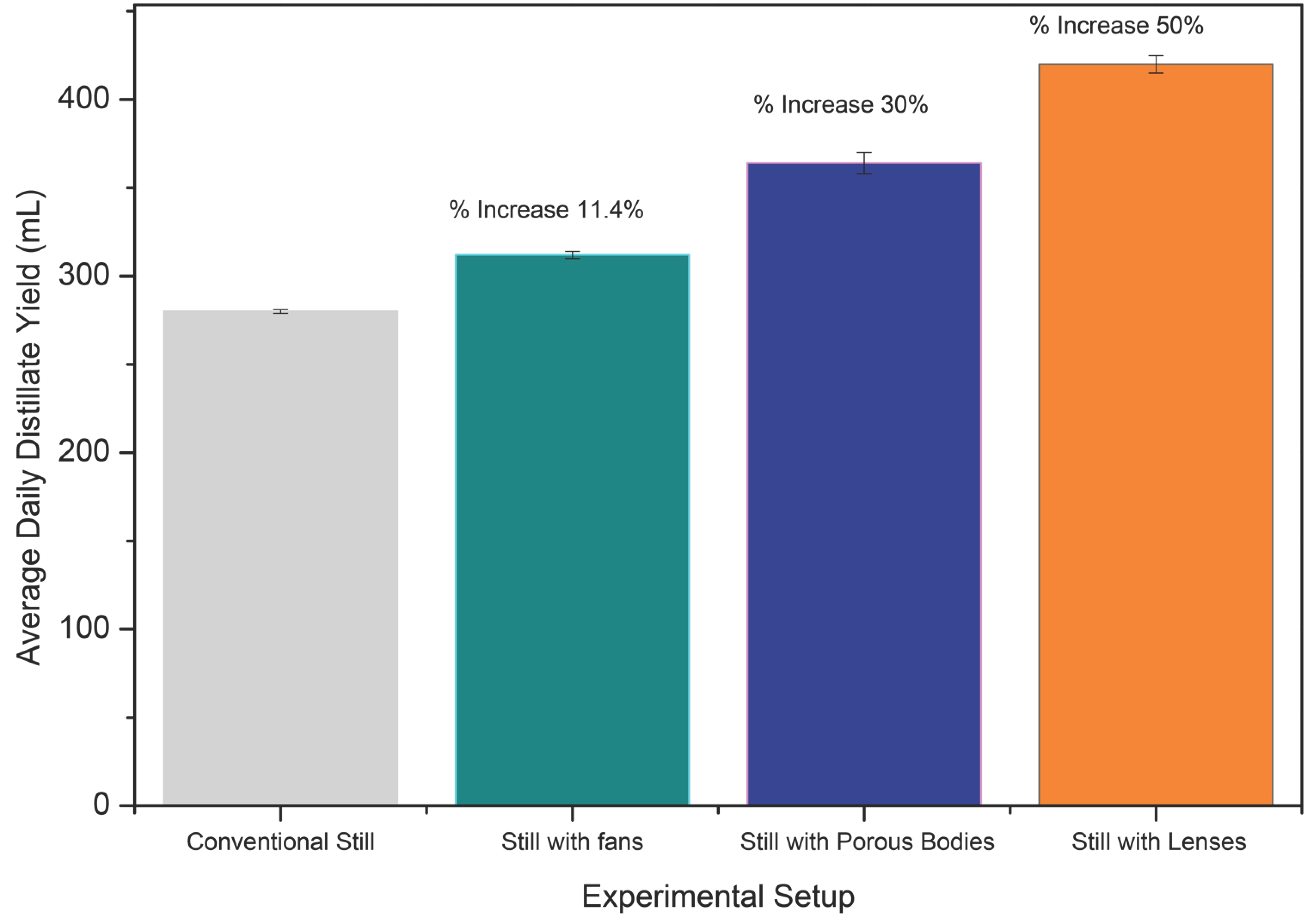 | Lenses | Solar energy concentration: Sunlight can be directed onto a still by lenses, which raises temperatures and greatly accelerates evaporation. Reduced Area Requirement: Lenses can increase the efficiency of smaller stills by concentrating sunlight. High Efficiency: In areas where sunshine is plentiful, using lenses can lead to extremely high evaporation rates. Using lenses increase the daily distillate water production by about 50%. | Complexity: Because lenses need to be installed and aligned precisely, their design and execution can be more complicated than other approaches. Cost and Accessibility: High-quality lenses may be more costly and not always easily accessible. |