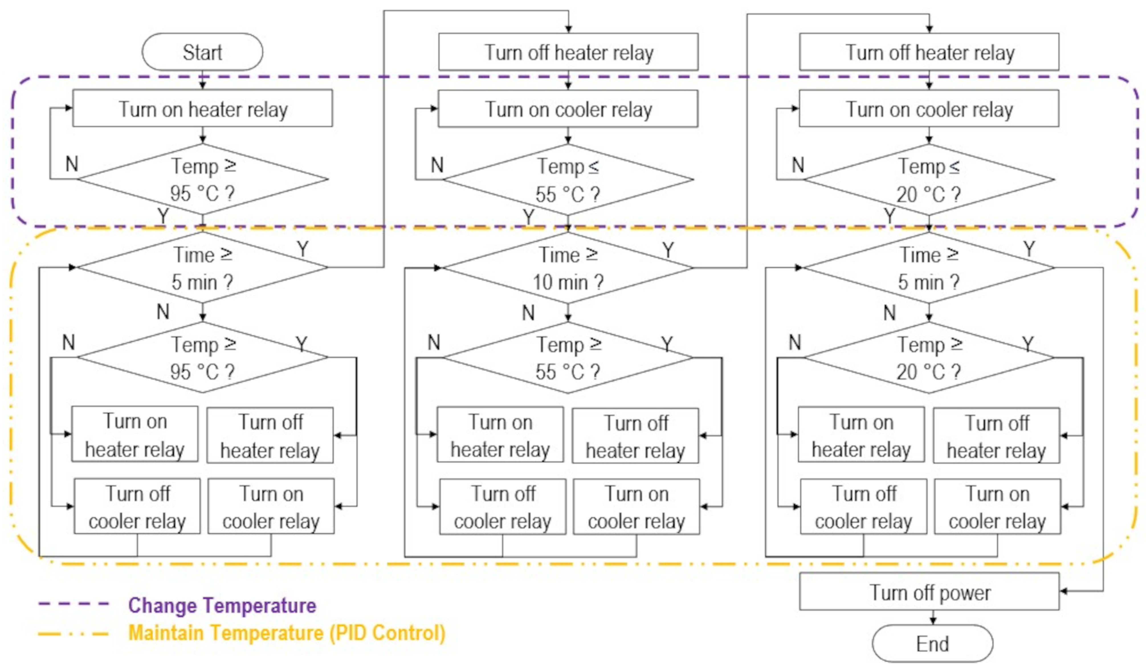 - The machine must control the temperature of the DNA to for 5 min, for 10 min, and for 5 min, corresponding to the three DNA hybridization phases, namely denaturation, annealing, and cooling, respectively.
