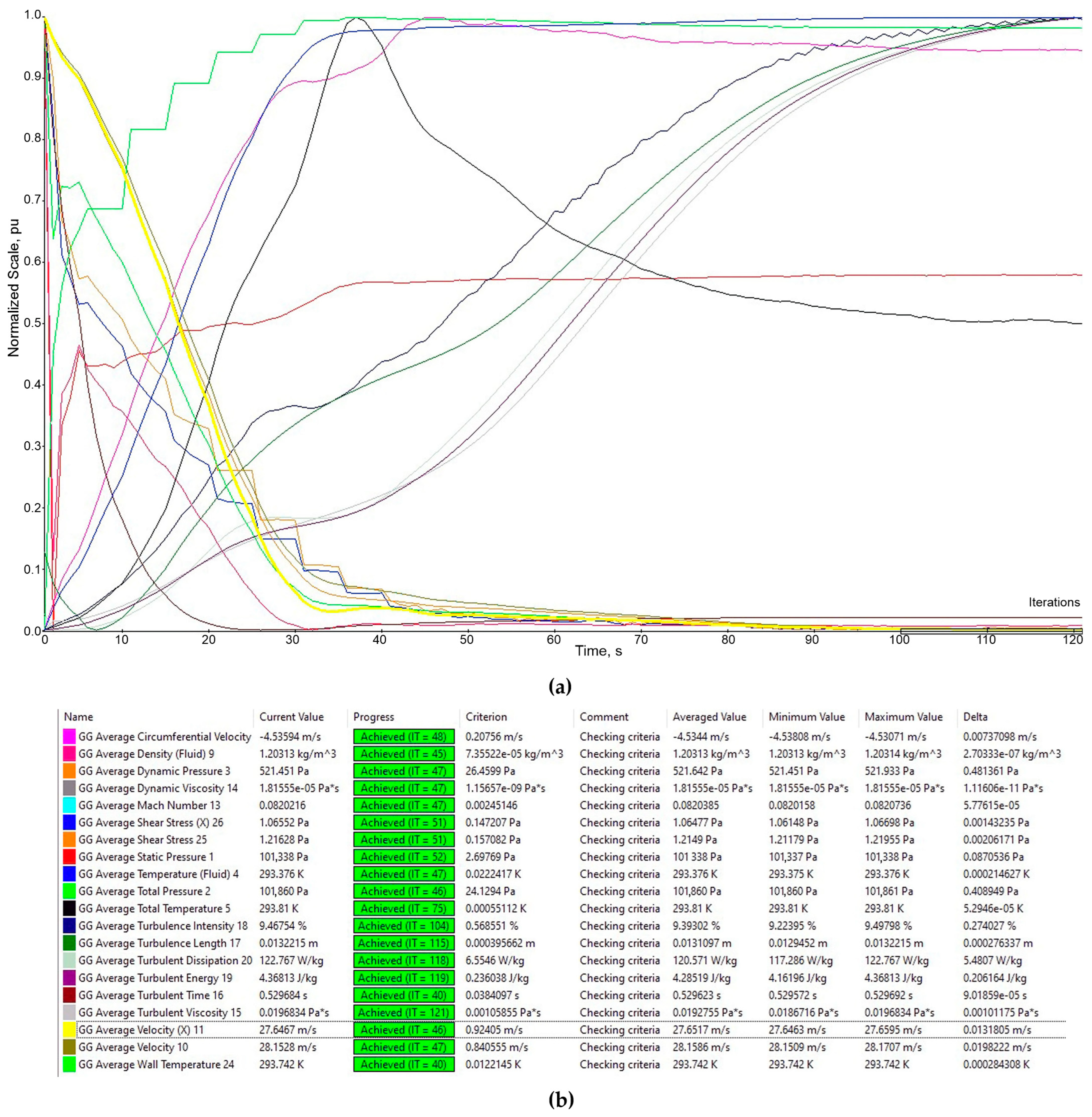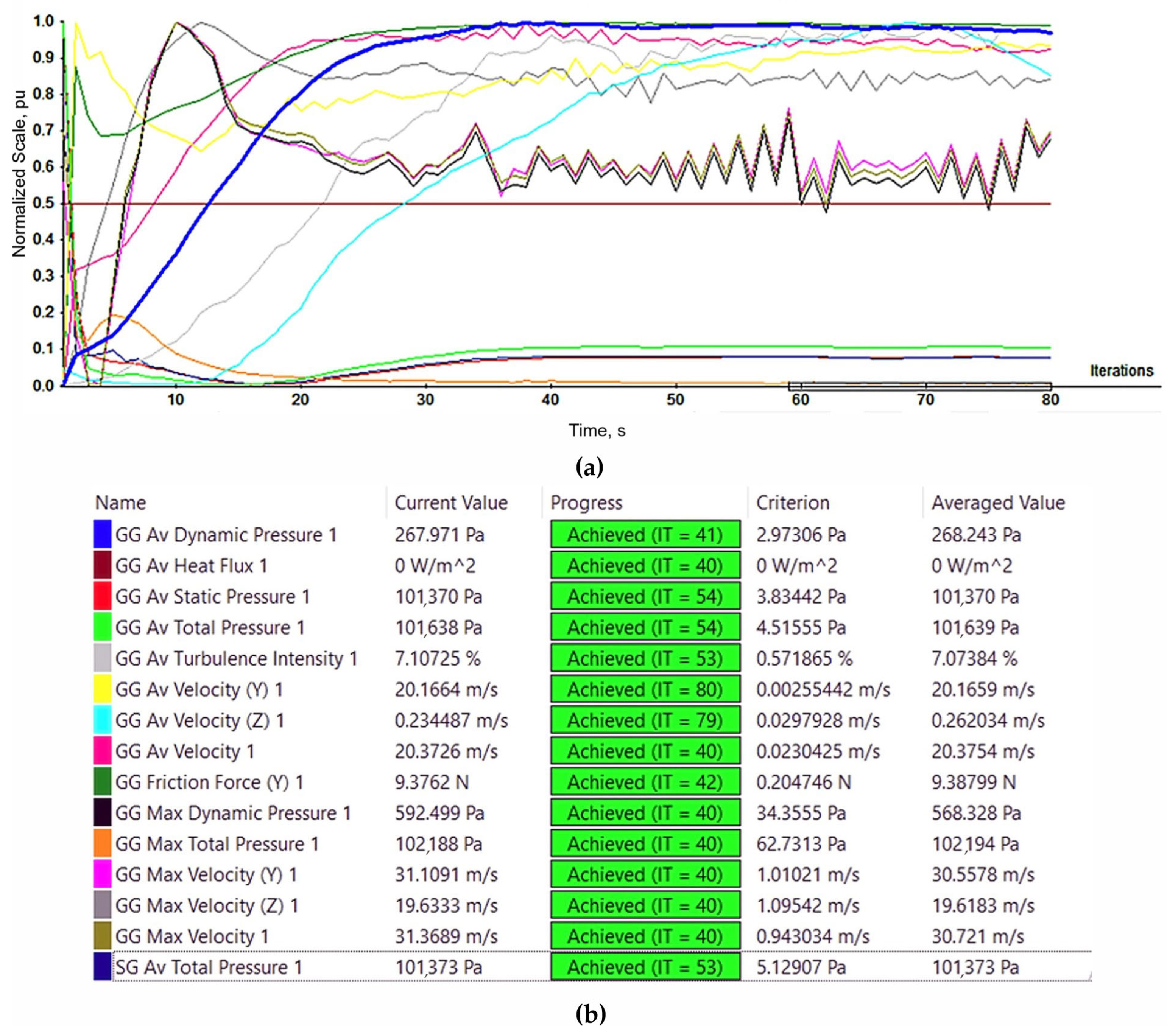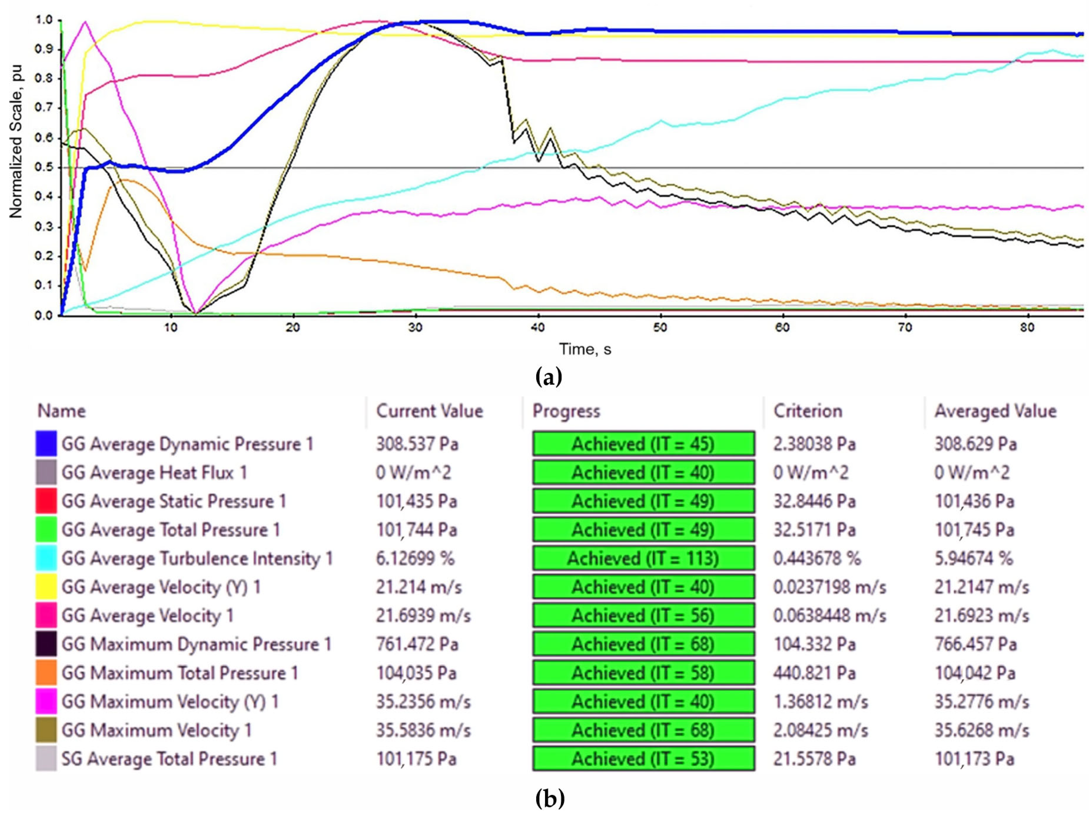 Figure 8a presents a graph of the normalized operating parameters of the Darrieus rotor during the numerical simulation process, where one iteration corresponds to one second; thus, the x-coordinate is time t in seconds. All quantities are phase-averaged over the last 8–10 revolutions; the running mean plateau (<1% variation) demonstrates convergence. Normalization allows for the assessment of the dynamic changes in parameters over time on a scale from 0 to 1, which helps visualize the stabilization of the system after a certain number of iterations. The blue line represents dynamic pressure, which increases during the first 30 iterations (30 s) and reaches its peak, after which it stabilizes at a level of 1. This indicates the achievement of a steady operational mode of the rotor. The purple line corresponds to the total pressure (static plus dynamic pressure), which also stabilizes after 30 s. This pressure is important for assessing the aerodynamic load on the rotor. The yellow line shows turbulence intensity, which increases during the first 30 s and reaches a level of about 6%. This indicates a low level of turbulence in the system, which positively affects the rotor’s efficiency. The green lines on the graph reflect different components of the airflow velocity (vertical and overall velocities), which also stabilize after the first 30 s, indicating an established operational mode. Overall, the graph demonstrates that after the first 30 iterations, the rotor’s parameters stabilized, indicating the achievement of a steady working state.