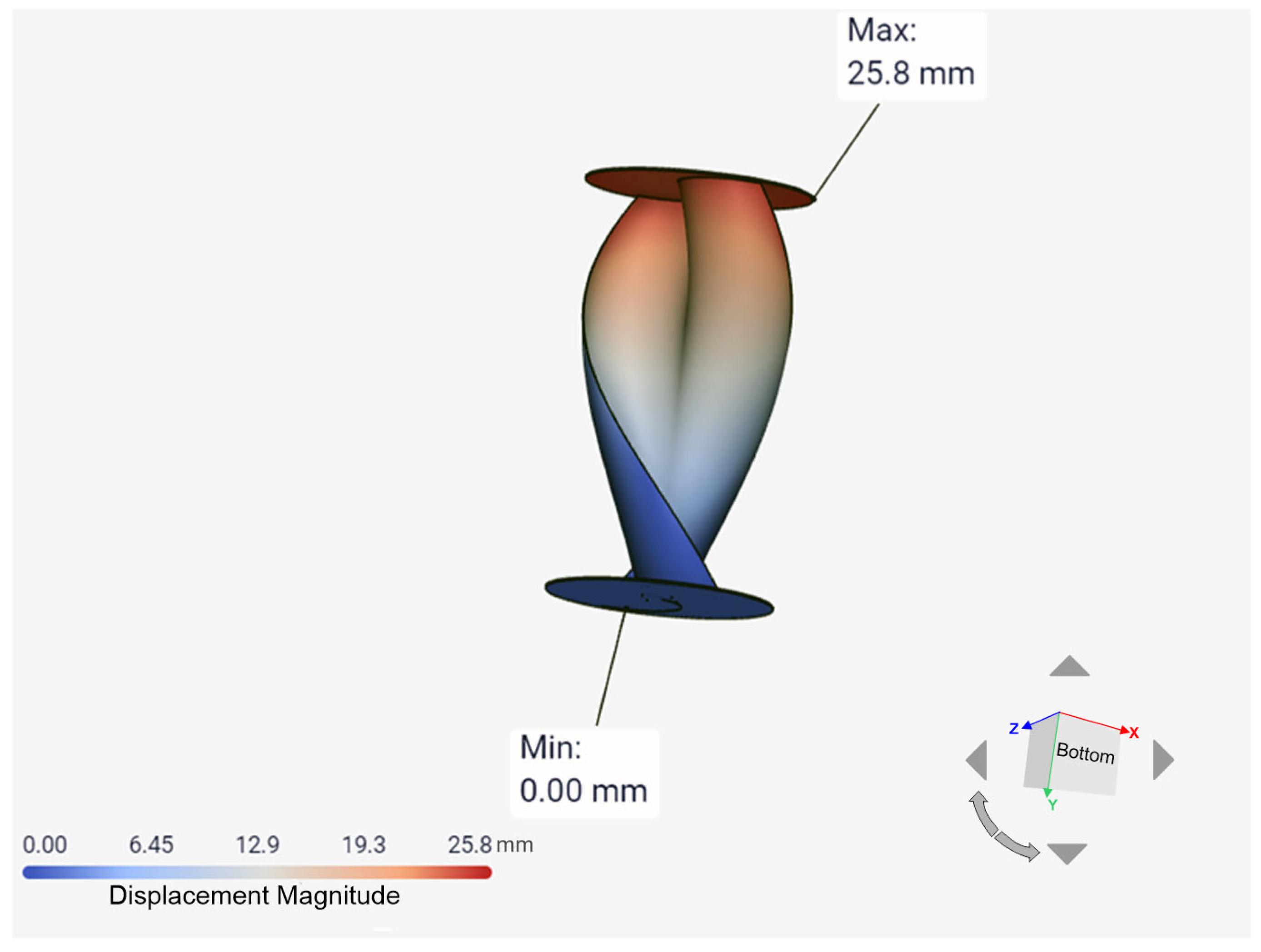 The experiment modeling the deformation of a two-stage Savonius rotor was conducted to study its behavior at a critical wind speed of 25 m/s, in order to assess the structural stability and identify potential areas of stress concentration. The rotor model has a height of 2 m and blade radius of 0.5 m, and it is made of aluminum with a Young’s modulus of E = 69 × 10