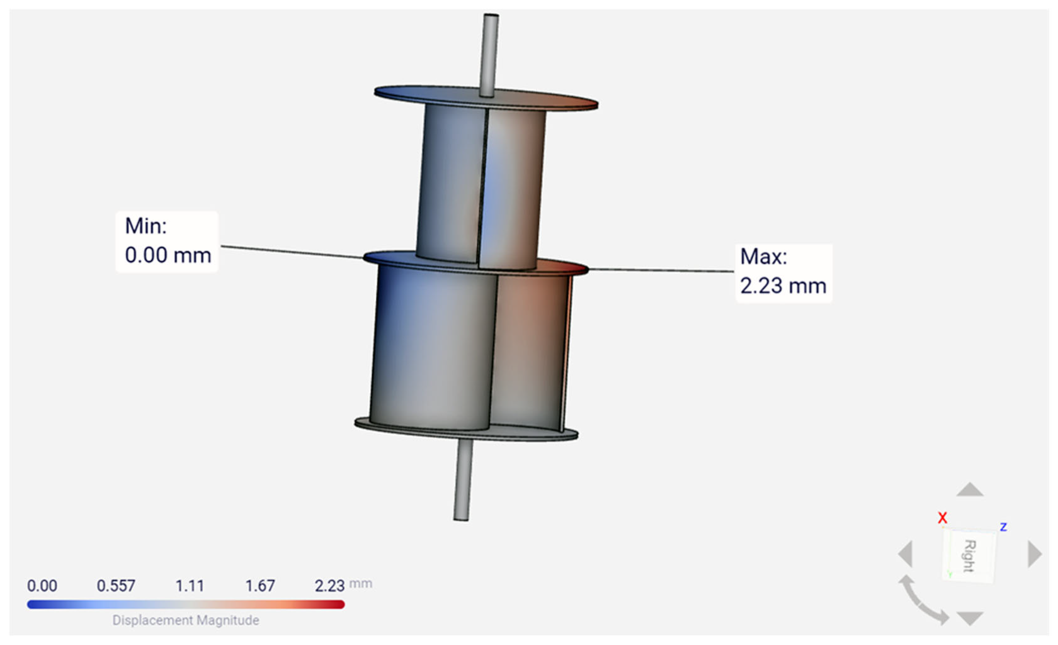9 Pa. A wind speed of 25 m/s was chosen as critical to evaluate the load on the rotor. Based on the simulation, it was determined that the maximum displacement of the structure was 2.23 mm at the top of the rotor, as shown in
