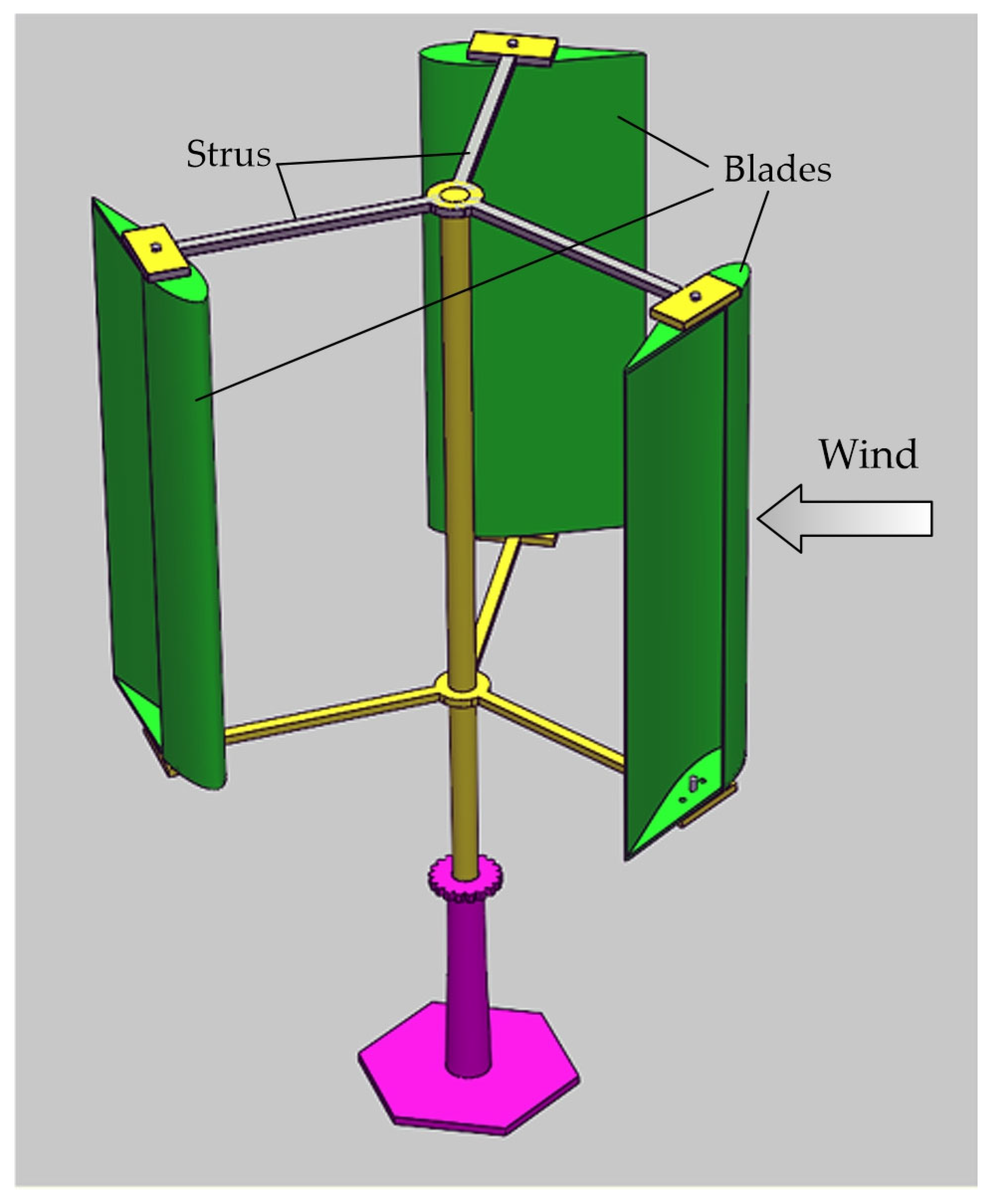 Figure 9). During the simulation, a rotor with a height of 2 m and blade radius of 0.5 m with curved blades was used. The rotor material chosen was aluminum with a Young’s modulus of