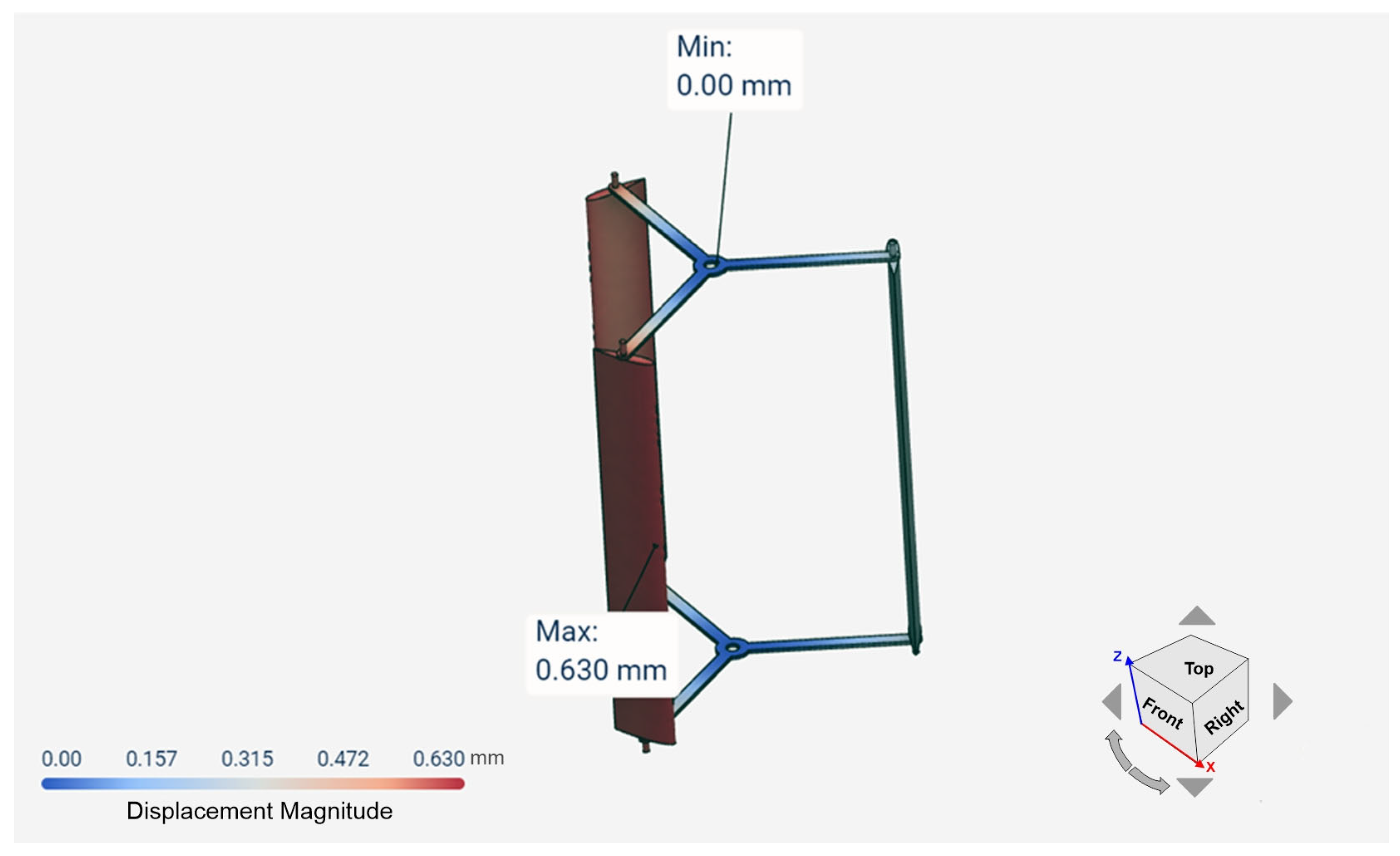 9 Pa, which allowed for an accurate assessment of stresses in the structure. A wind speed of 25 m/s was set as critical for this type of rotor, with the pressure on the rotor surface calculated based on the wind speed and airflow characteristics. Based on the simulation, data on structural displacement were obtained: the maximum displacement was 0.630 mm at the top of the rotor, as shown in the figure. This displacement is significantly lower compared to more flexible designs, indicating the high stability of the Darrieus rotor.
