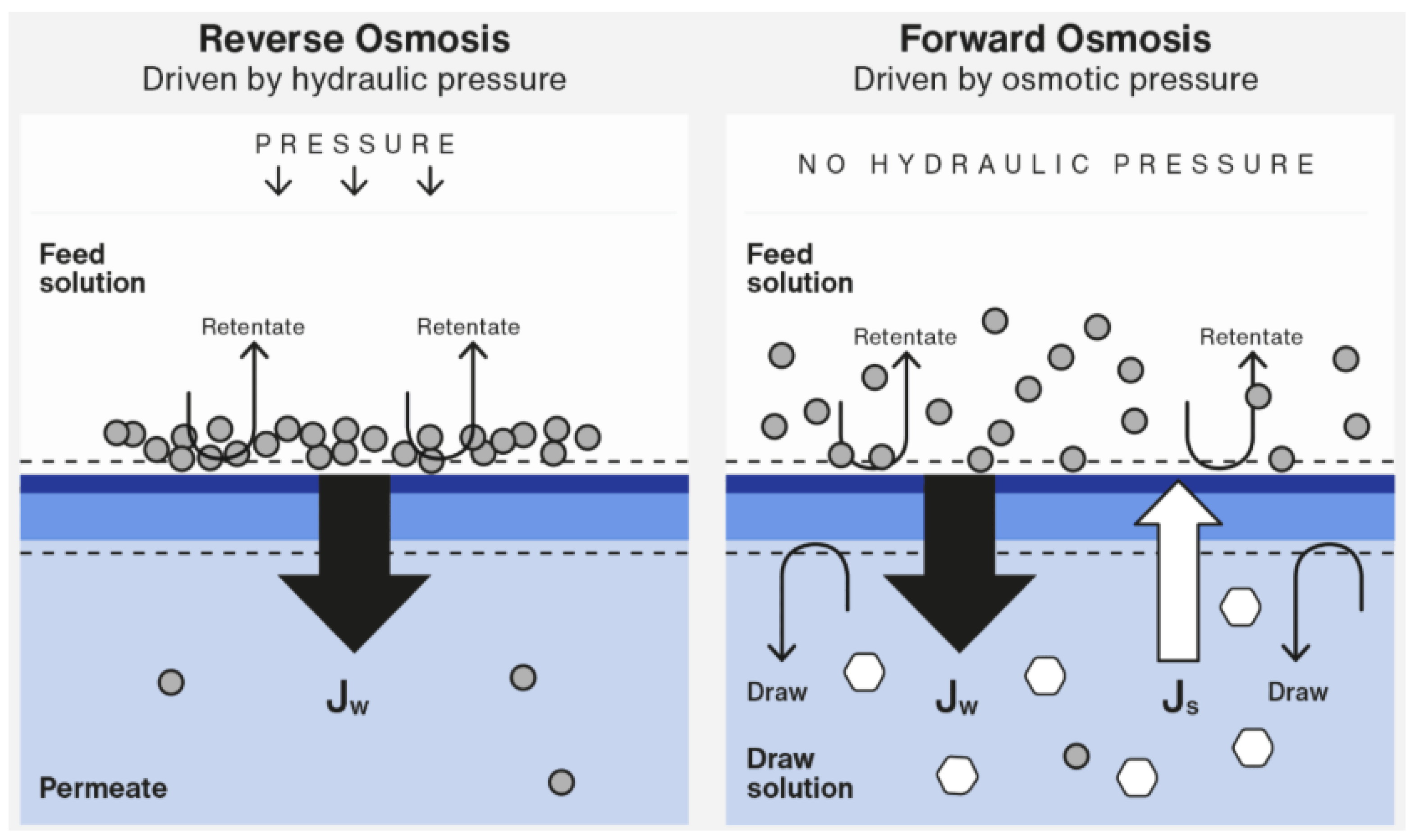 In contrast, Forward Osmosis (FO) operates on a different principle. FO is an emerging process that utilizes a natural osmotic gradient, rather than hydraulic pressure, to draw water across a semi-permeable membrane from a dilute solution (like feedwater) into a highly concentrated “draw” solution in this case both water flux (Jw) and some solute flux (Js) (