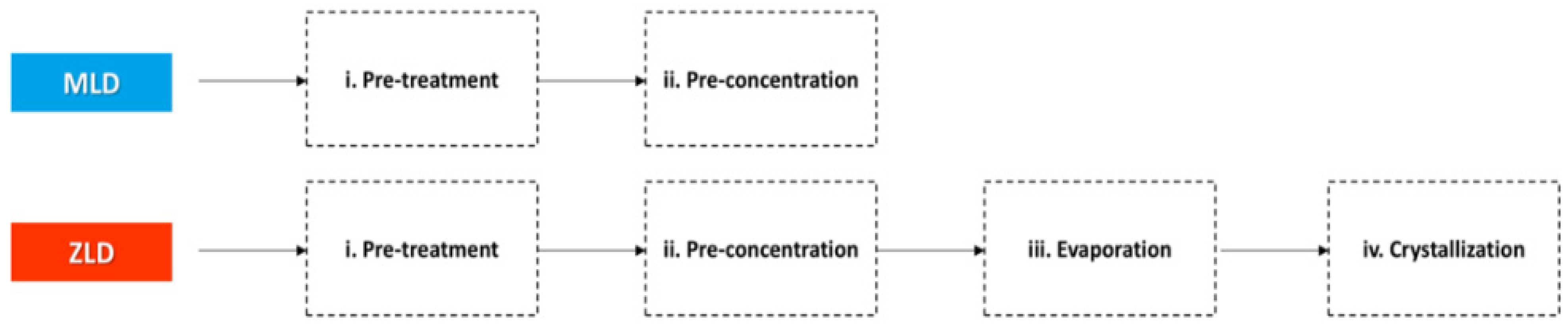 Current, common approaches include deep-well injection, using evaporation ponds, or dilution with other water outflows. More advanced, albeit high-cost, methods aim for Minimal Liquid Discharge (MLD) or Zero Liquid Discharge (ZLD). ZLD systems, which require four process steps, differ fundamentally from MLD systems, which only require two (as detailed in
