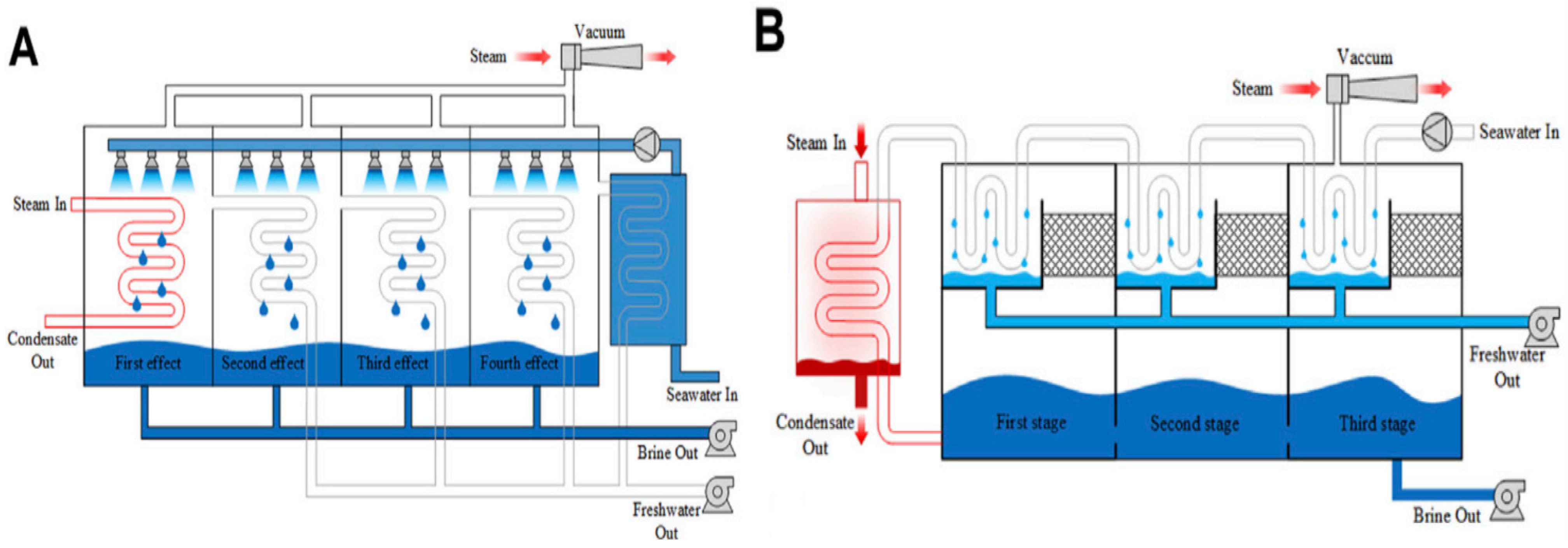 Figure 6 illustrates the two distinct distillation processes: Multi-Effect Distillation (MED) in panel A and Multi-Stage Flash (MSF) Distillation in panel B.