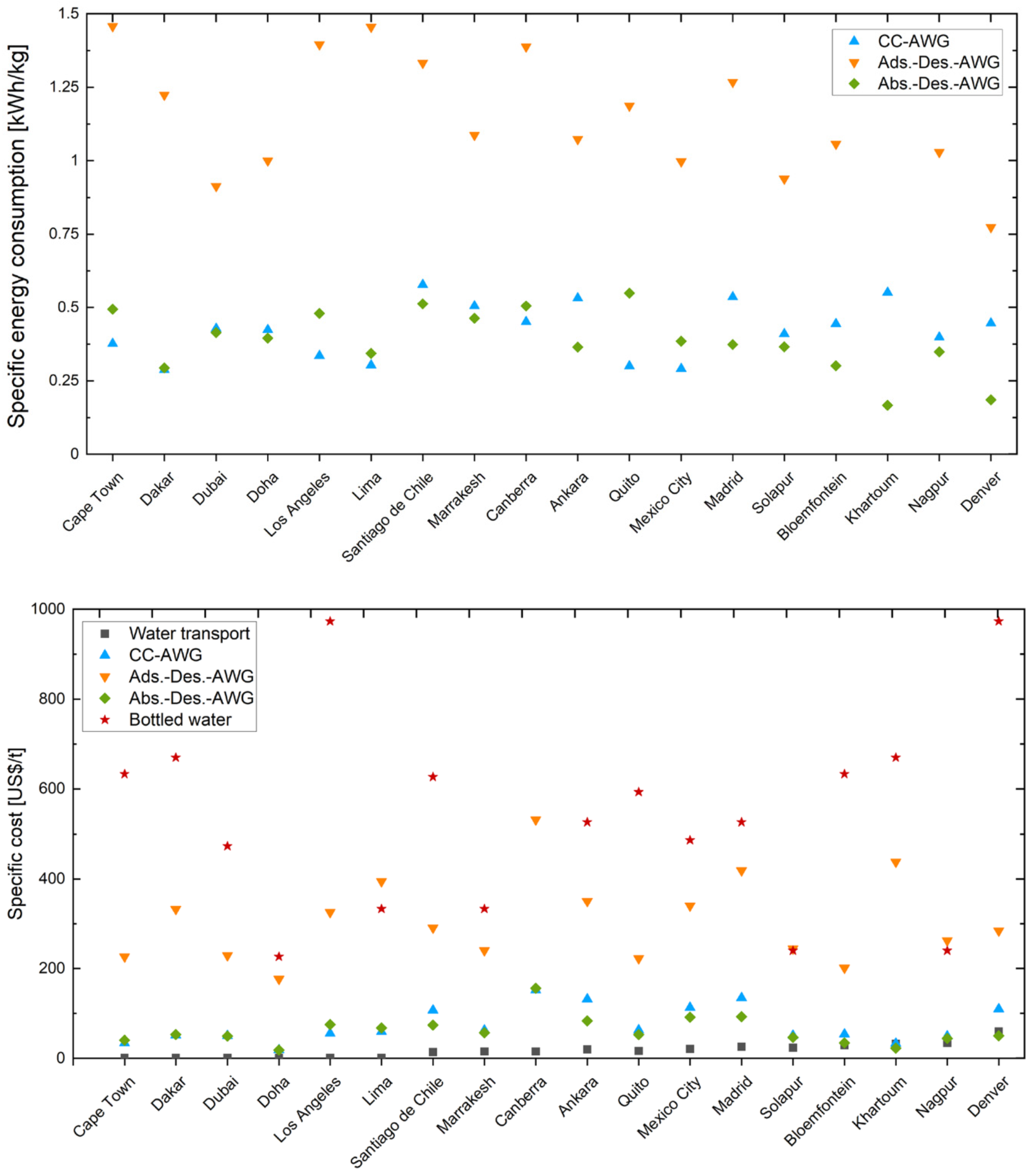 26] conducted a detailed analysis comparing the energetic and economic feasibility of three active atmospheric water generation (AWG) technologies: cooling condensation (CC-AWG), adsorption-desorption (ads.-Des.-AWG), and absorption-desorption (abs.-Des.-AWG). This involved thermodynamic modeling and location-specific economic comparisons against bottled water (