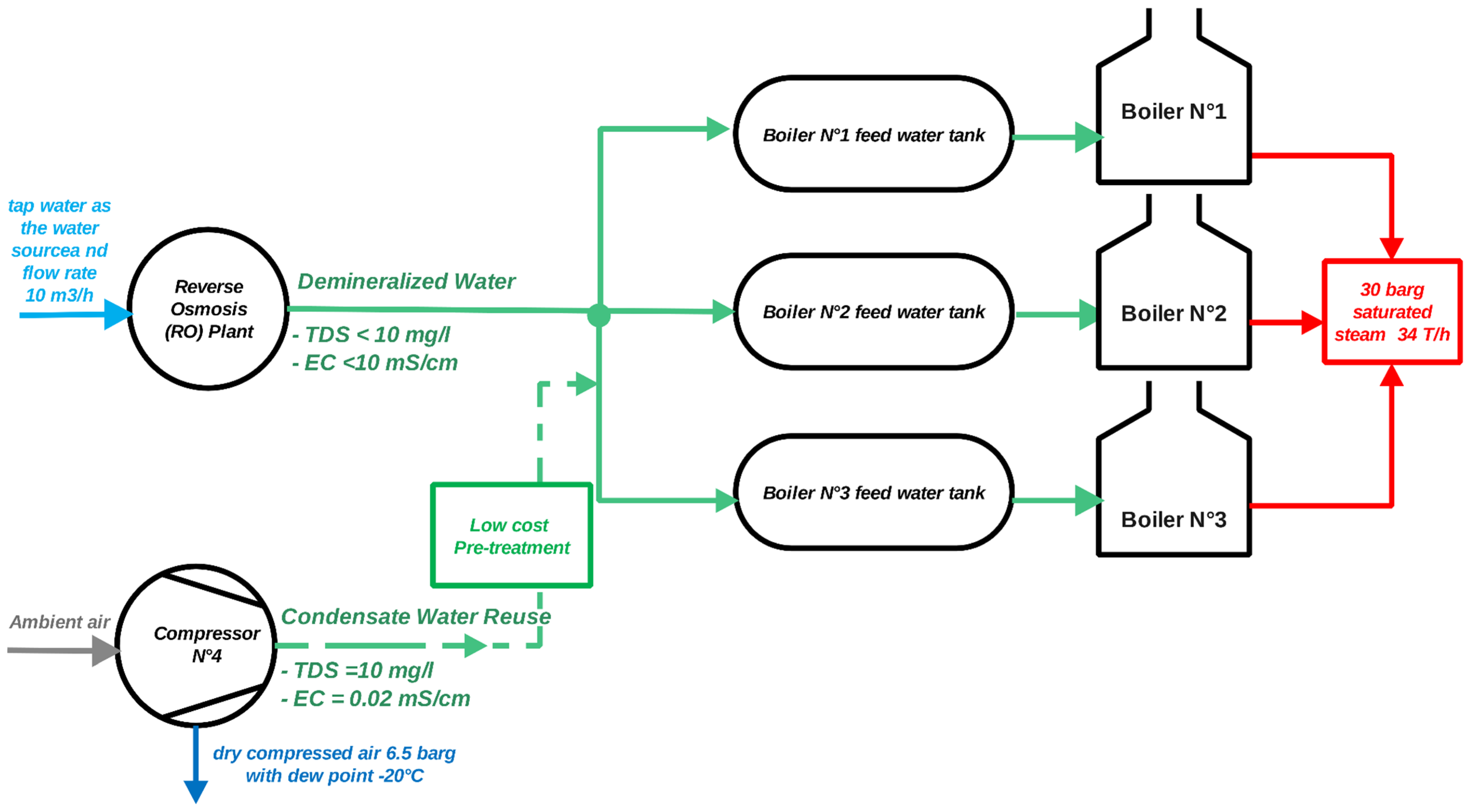 Section 2.2 confirms that the condensate from air compressor N°4 is a high-quality byproduct, ideally suited for recovery and reuse as demineralized water for the three on-site boilers. Under typical operating conditions (20 °C ambient temperature, 70% relative humidity, and 80% + VSD compressor load), the flow rate is approximately 19 L/h. The excellent quality of this water (Total Dissolved Solids (TDS) = 10 mg/L; Electrical Conductivity (EC) = 0.02 mS/cm) allows it to directly supplement the boiler feed tank supply. Only a simple, low-cost pretreatment, as illustrated in