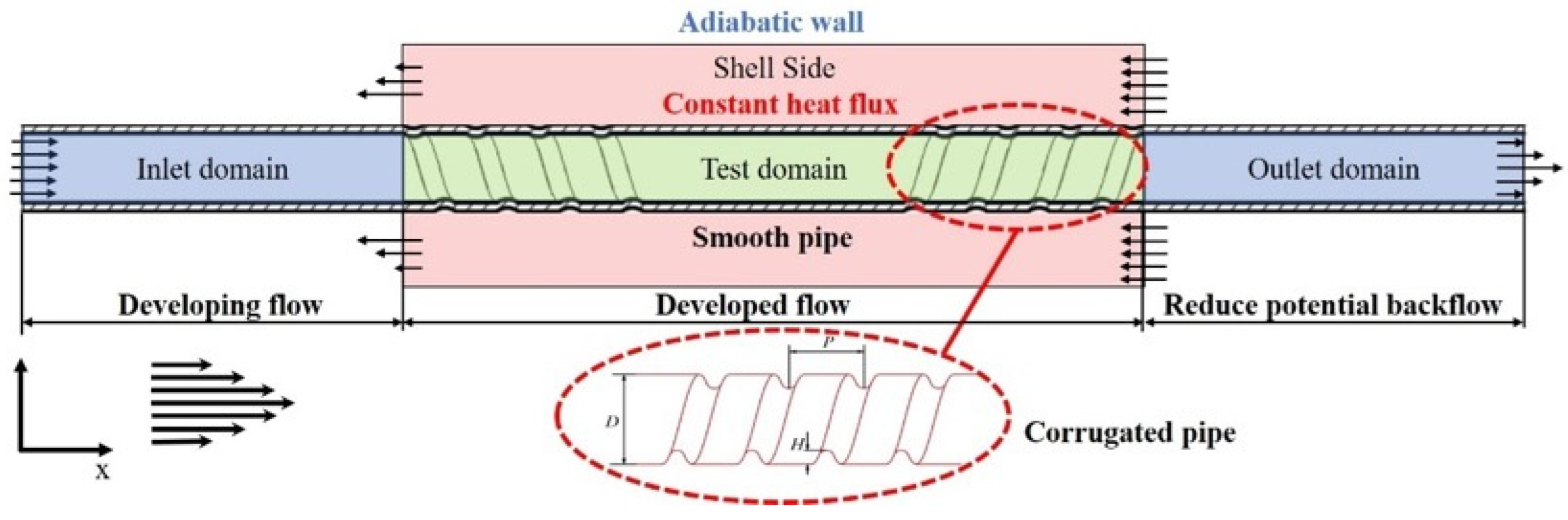 - Heat transfer mechanism: Corrugated segments act as vortex generators, periodically disrupting the thermal boundary layer, inducing secondary flows, and intensifying fluid mixing to enhance heat transfer. The novel tube’s defining innovation (smooth segments between corrugated sections) allows turbulent kinetic energy (TKE) from corrugated zones to decay and redevelop—sustaining enhanced heat transfer while avoiding the excessive, continuous pressure rise of fully corrugated conventional tubes.