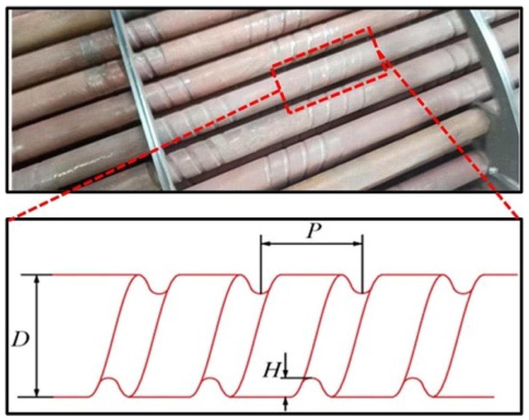 - Akbarzadeh, S.; Valipour, M.S. Experimental Study on the Heat Transfer Enhancement in Helically Corrugated Tubes under the Non-Uniform Heat Flux. J. Therm. Anal. Calorim. 2020, 140, 1611–1623. [Google Scholar] [CrossRef]