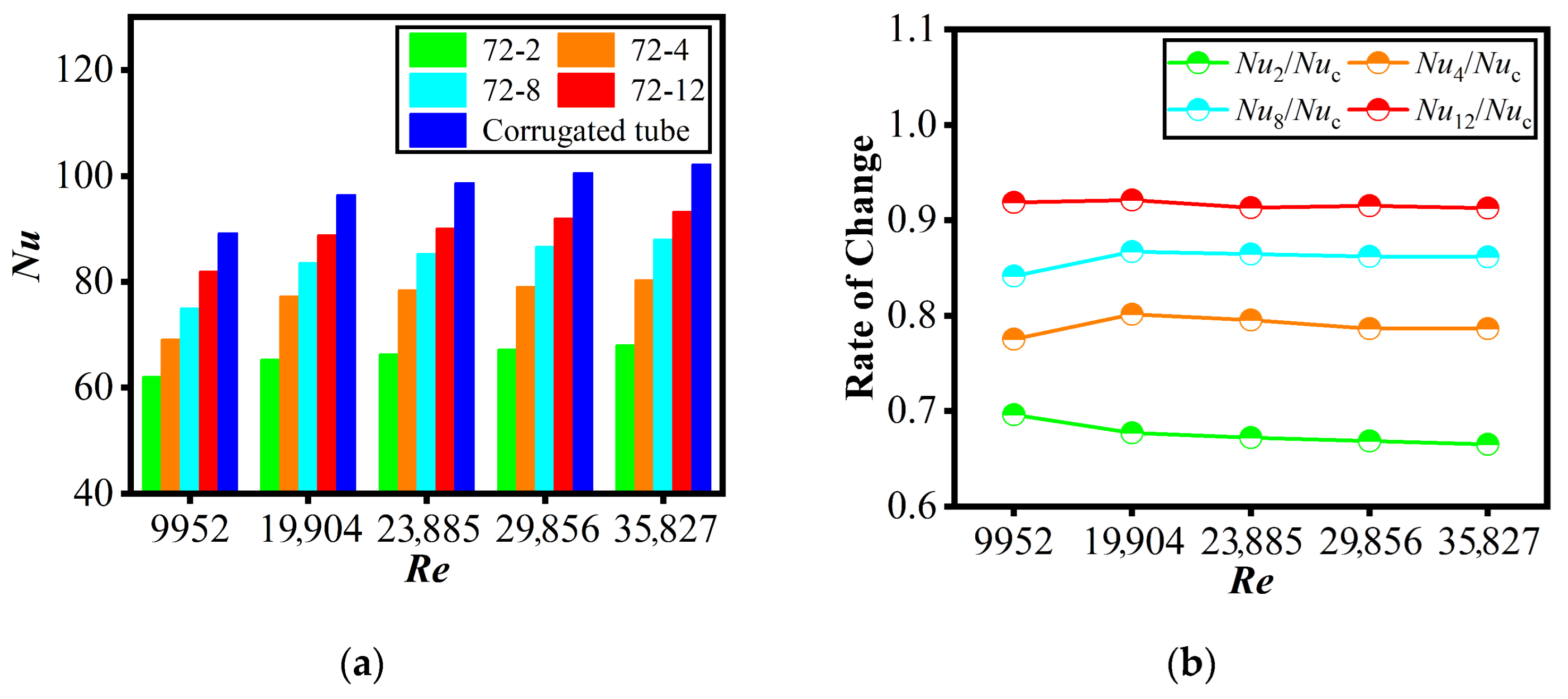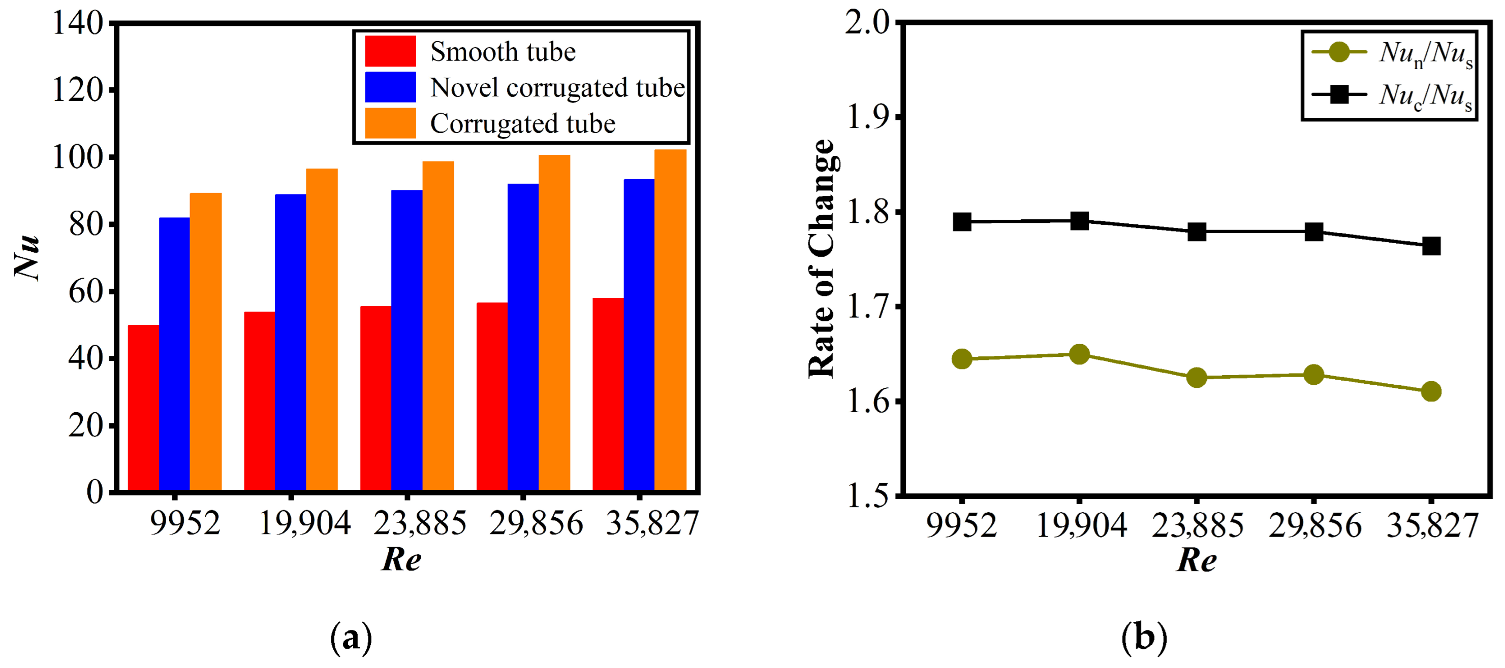 - Performance balance: The novel tube achieved a superior trade-off: it maintained substantial heat transfer enhancement (Nun/Nus ≈ 1.61–1.65) while limiting flow resistance growth (fn/fs ≈ 1.56–1.93). In contrast, the conventional corrugated tube (though achieving higher heat transfer, Nuc/Nus ≈ 1.76–1.79) incurred a steep pressure penalty (fc/fs = 2.96)—making the novel tube well-suited for pump-power-constrained scenarios.