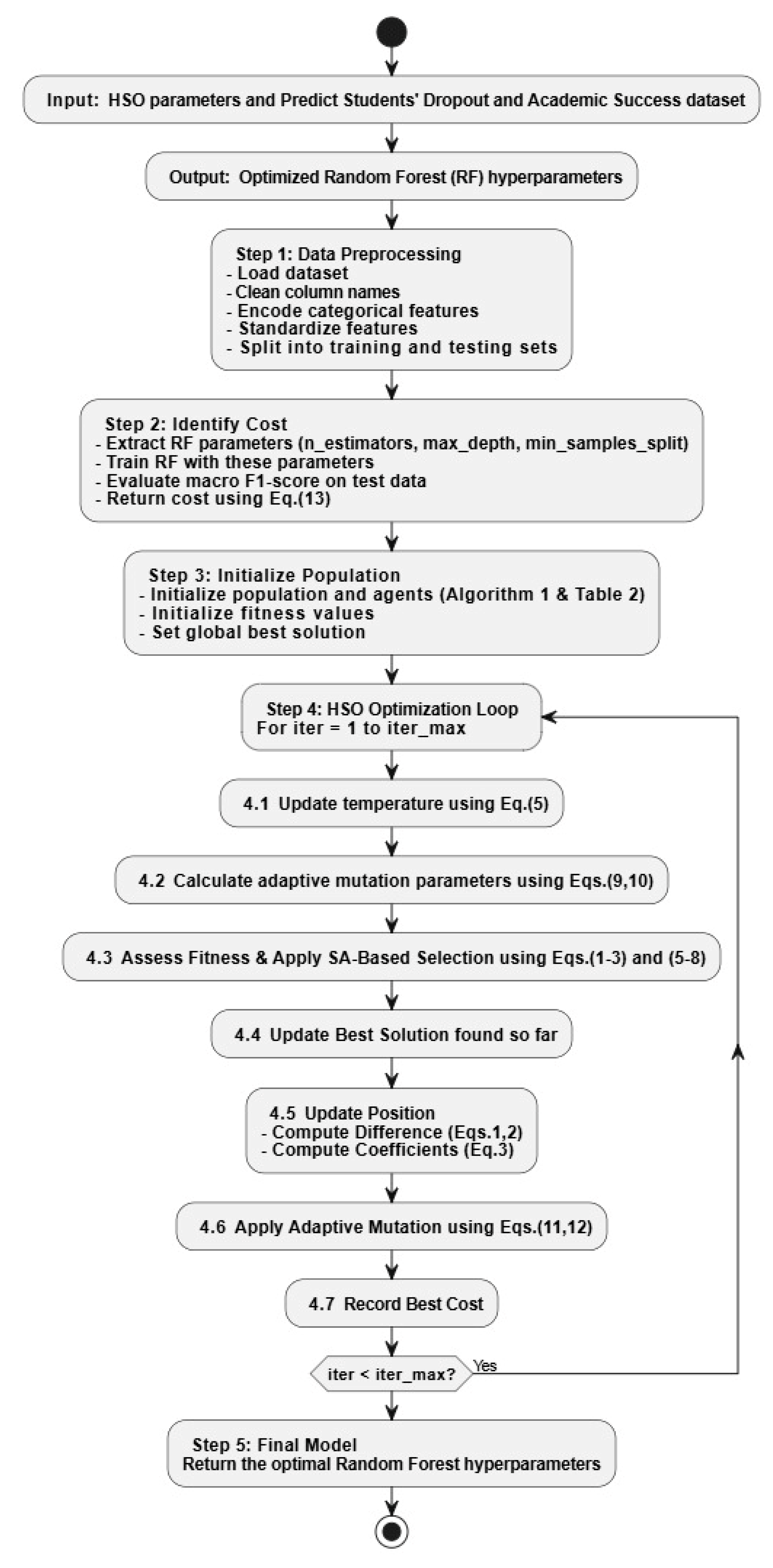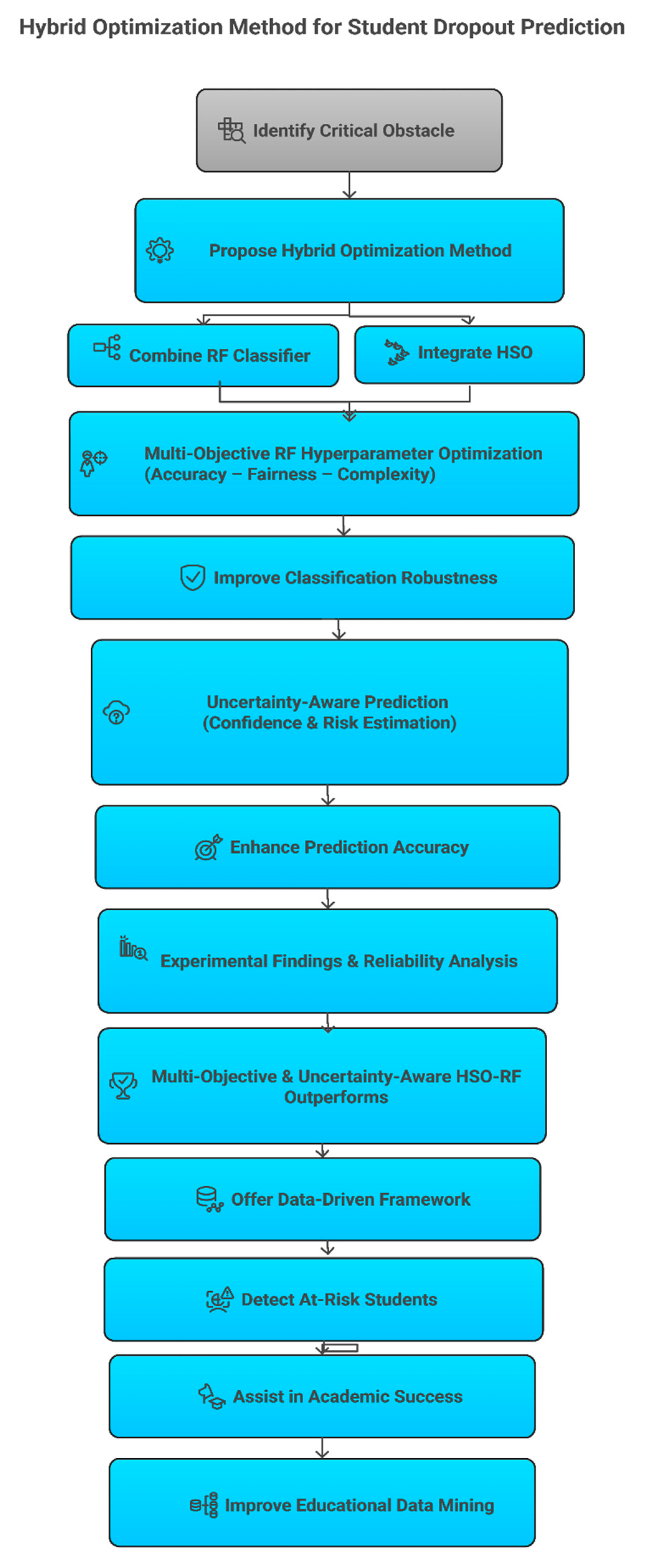 2]. Unlike traditional swarm methods like PSO, AFSA, and GWO, which simulate metaphor-driven behaviors such as birds, HSO guides search movement by the entire population’s fitness distribution. Hence, HSO obtains a global view of the search space. Thereby, this research introduces HSO as an optimization algorithm to improve RF capabilities by tuning its hyper parameters. The prediction model is used to predict student dropouts from university programs based on a multi-objective and uncertainty-aware hybrid optimization framework. As HSO is a novel metaphor algorithm not used in an educational prediction model, this research tends to benefit its exploration and exploitation capabilities to tune RF hyperparameters to predict students at risk of dropout, saving their time and university resources as well. The next section presents methods and materials of the proposed HSO-RF hybrid model.