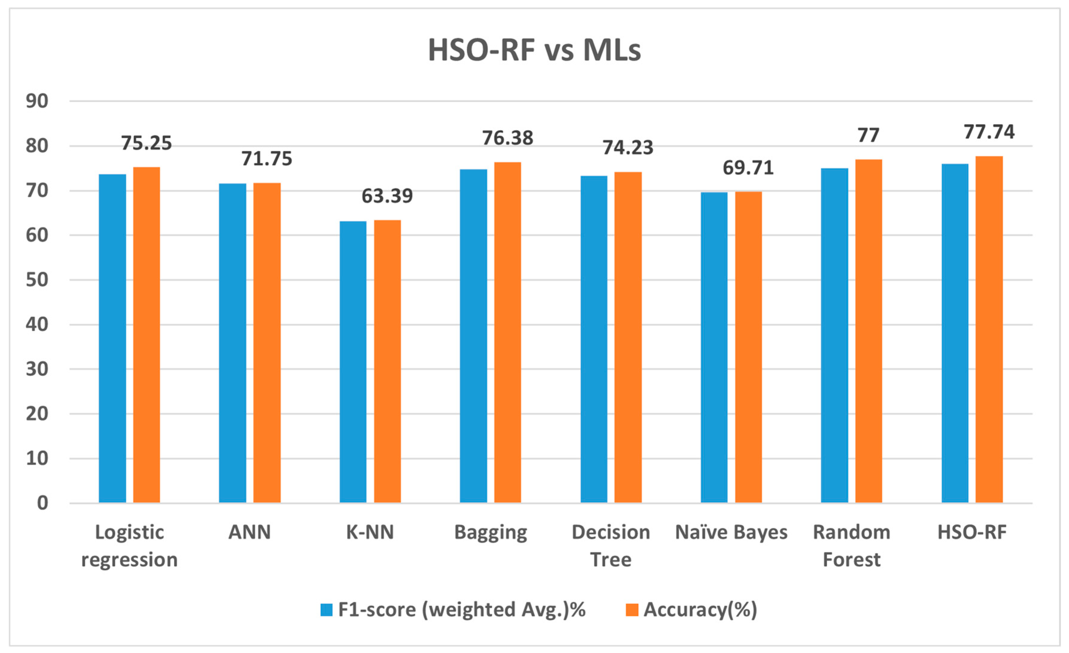 8], making it possible to identify high-risk students with different degrees of confidence. This capacity facilitates more knowledgeable and successful academic interventions, especially in early warning systems for dropout risk and student performance. The integration of the advanced, more accurate algorithm HSO, along with the reliable RF, enhances the prediction process, tunes hyperparameters, and thus increases accuracy.