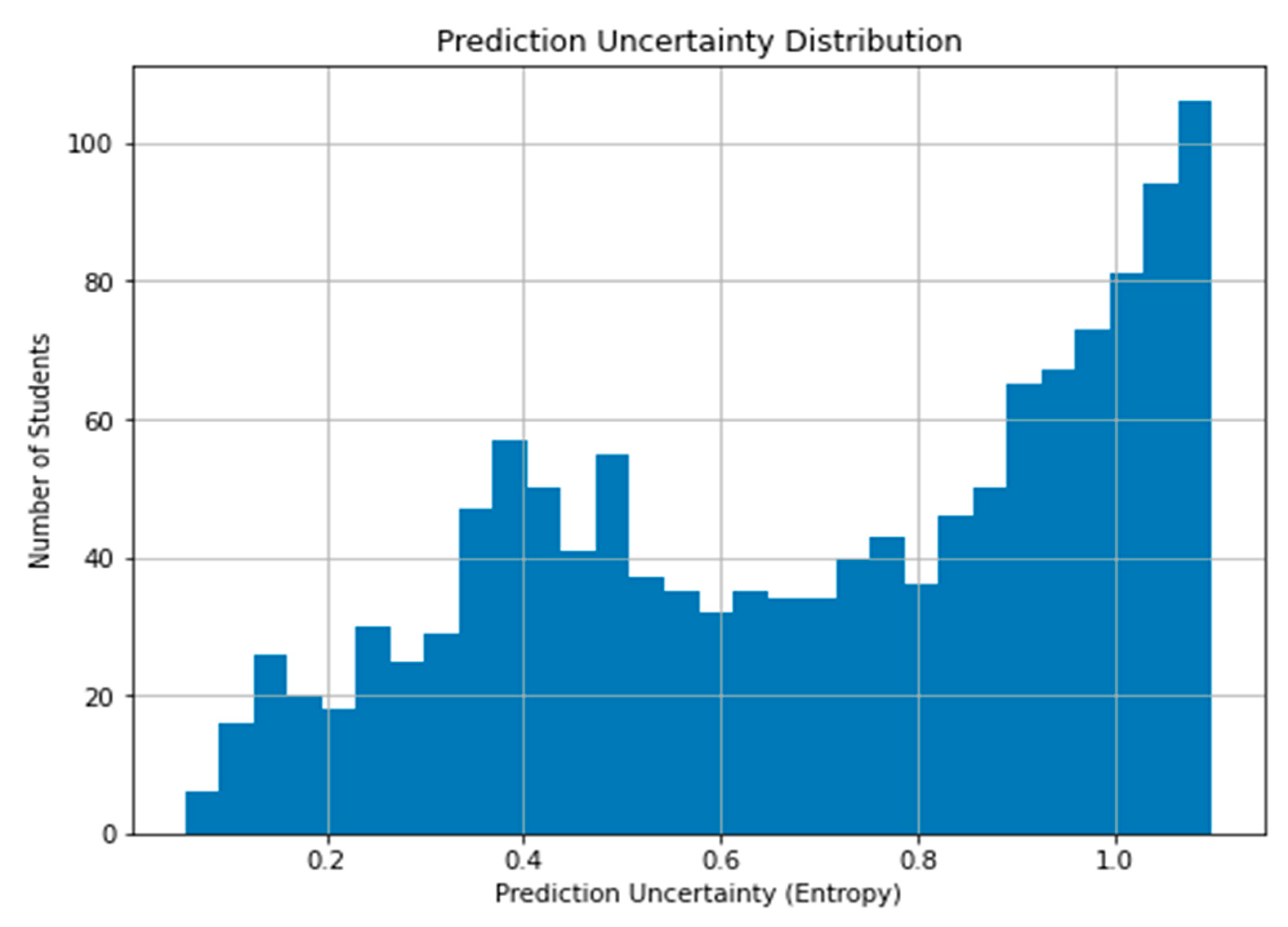 In addition to improving performance, uncertainty-aware prediction is a major improvement over the deterministic student risk model. Because some student profiles are inherently ambiguous, the entropy-based uncertainty distributions show significant variation in prediction confidence. Higher predictive entropy is closely correlated with misclassification risk, as evidenced by the distinct divergence between uncertainty levels for successfully and wrongly categorized examples. This result provides empirical support for the suggested uncertainty modeling approach’s efficacy and emphasizes its significance for practical implementation, as decision-makers must choose between trustworthy alarms and unclear situations that need more research.
