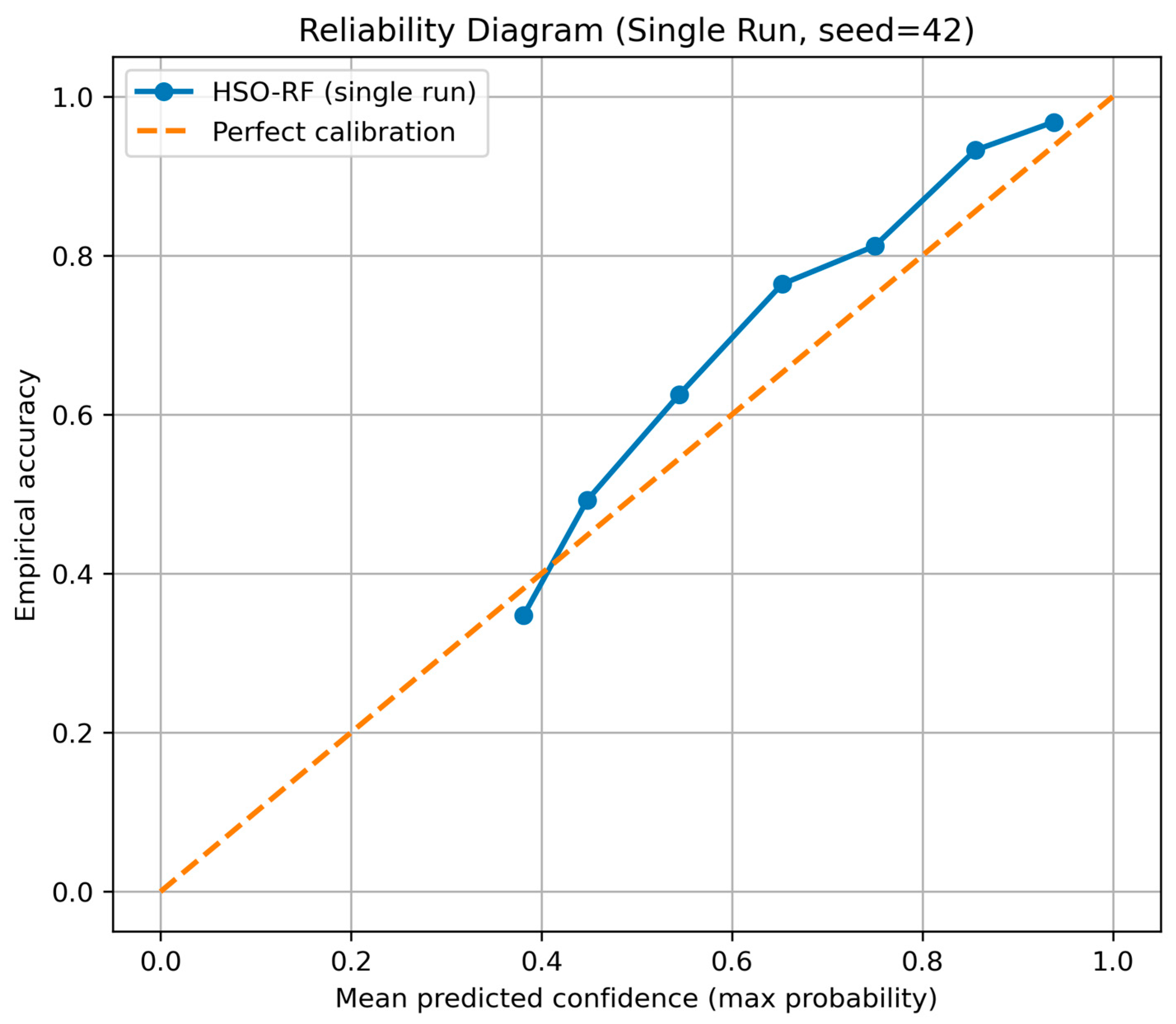 The study’s findings show that incorporating uncertainty-aware prediction and multi-objective optimization into an RF framework significantly improves the reliability and robustness of multiclass student outcome prediction. The suggested HSO-RF framework clearly balances predictive performance, model complexity, and inter-class fairness, in contrast to traditional methods that maximize predictive accuracy alone. This produces more dependable results when there is a significant class imbalance. Despite being numerically modest, the observed increases in macro and weighted F1-scores are especially significant in educational datasets where minority groups, like dropout instances, are frequently underrepresented and more challenging to predict.