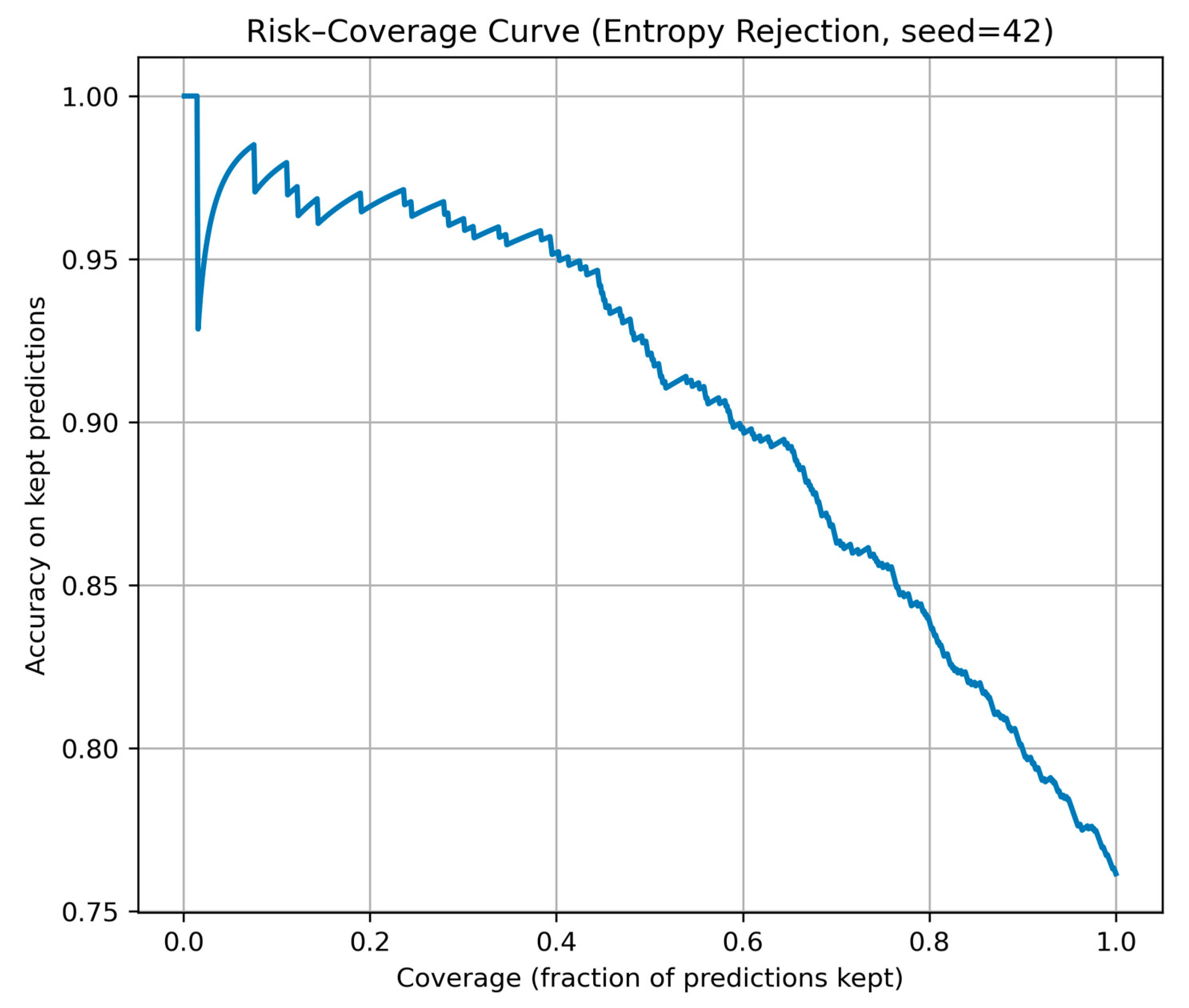 Uncertainty-aware outputs allow for more sophisticated academic interventions from an applied standpoint. While high-uncertainty scenarios might benefit from postponed choices, more data collection, or human review, high-confidence predictions can initiate urgent support actions. This capability, which emphasizes openness, dependability, and risk-aware decision-making in delicate areas like education, is consistent with growing ideals of trustworthy and responsible artificial intelligence.