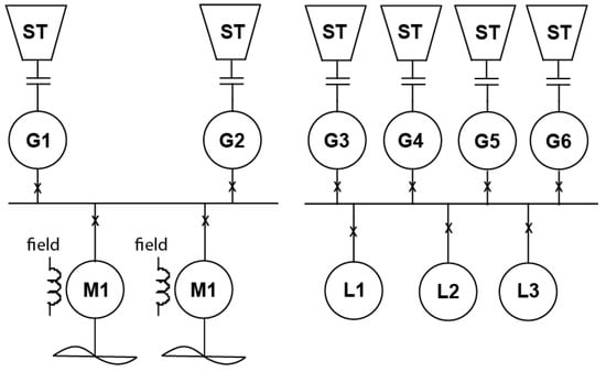 Traditional ac ship power systems are based on the radial power distribution architecture and having separate generators for propulsion and service loads. The SS Canberra, ocean liner, is a good example for this architecture. Single line diagrams of her power systems are shown in Figure 1. The propulsion system is powered by two steam-turbine-coupled 32.2 MW generators, while the service loads are supplied by four steam-turbine-coupled 1.5 MW generators. This approach helps prevent transients and oscillations in the propulsion power system propagating into the service power system. However, in this system, the excess capacity of the propulsion power system at low speed or when the ship is not moving is not usable. Therefore, the utilization of available resources is very low in this approach and it results in low efficiency in the overall system [5,6,7,8]. In addition, with the growth of the power demand in service loads in modern ships maintaining two large power systems is not efficient and economical.