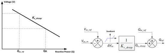 Reactive power control is the most commonly used strategy for mitigating voltage sags in microgrids, and will also allow microgrid to ride-through faults [46]. This strategy is commonly known as Q/V droop control. Reactive power control/injection could be achieved either using existing power electronics based sources or additional dynamic reactive power devices, such as static synchronous compensators (STATCOMs) [44,51]. STATCOM is a system that can combine both active and reactive power capabilities into a single converter to achieve both frequency and voltage regulation and thus becoming popular in modern power systems. In Q/V droop control strategy, the error between actual and reference voltage is calculated (see Figure 5) and then processed through a droop constant (Kv_droop) to generate the reactive power reference (Qref), and ultimately based on the voltage error, the STATCOM will inject reactive power to the microgrid to compensate the voltage sag [51].