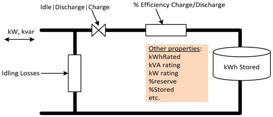 The storage element is modeled as a generator and is dispatched to either generate power by discharging, or consume power by charging, within its power rating and its stored energy capacity. In OpenDSS, ES is modeled as a generator (Figure 1). The storage element can also produce or absorb reactive power within the kVA rating of its inverter. The ES model supports power flow analysis in multiple time-scales, including Snapshot, Daily, Yearly, and Duty cycle modes []. In addition to equipment model and solution interfaces, OpenDSS also provides several control models for ES systems. The control modes are required for simulating the cases to demonstrate that the utility of ES is providing grid benefits.