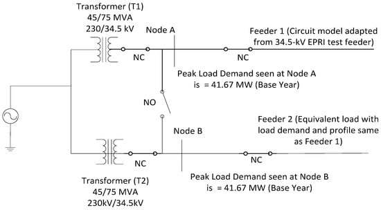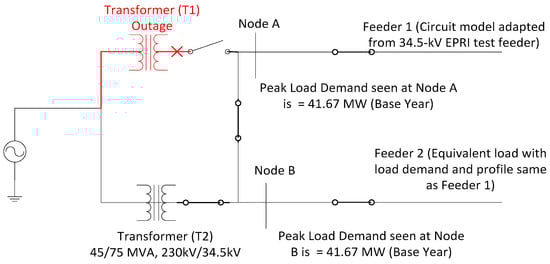 The one-line diagram for the test circuit is shown in Figure 2. In this study, we simulate two identical substation transformers supplying two distribution feeders with identical load demand characteristics and peak load demands. Note that under the N-1 contingency case, one of the transformers is out-of-service and the other transformer supplies both feeders. The distribution feeder supplied by Transformer T1, i.e., Feeder 1, is adapted from the 34.5-kV EPRI test feeder []. The feeder supplied by Transformer T2 is represented as an equivalent load with an identical load profile and load demand characteristics as Feeder 1. Both substation transformers are rated as having a normal MVA rating of 45 MVA and emergency rating of 75 MVA. The three-phase short-circuit capacity at the secondary of either substation transformer is 422 MVA.