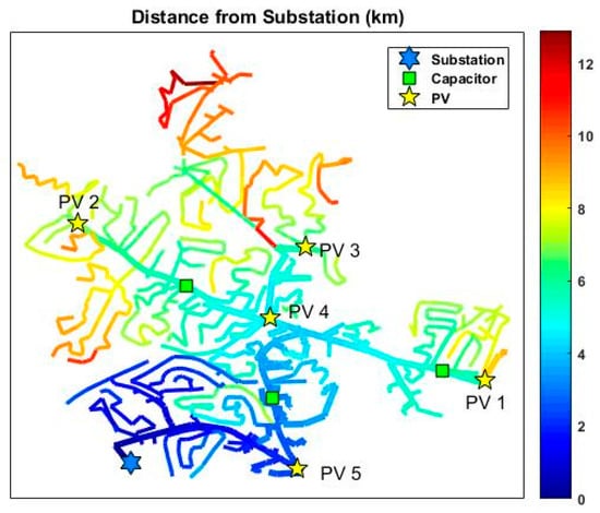The one-line diagram of Feeder 1 is shown in Figure 3 []. In Figure 3, the colors represent the distance of the feeder from the substation. The distance (in km) associated with each color is also shown in the figure. The detailed circuit characteristics for Feeder 1, including bus connections, primary-feeder characteristics, service transformer data, secondary-feeder characteristics, and customer load data, are available. Also, the yearly load profile measured at the substation transformer is available for one year, at a 1-h resolution. This circuit has three capacitors of 0.9, 1.2 and 1.2 Mvar. These capacitors are fixed and always online. The substation transformer is equipped with a load tap changer (LTC). Five PV systems are installed at a 34.5 kV voltage level of Feeder 1. Each PV is connected to the feeder via a 1.2-MVA 34.5/0.48-kV service transformer and has a capacity of 1 MW, with a total installed capacity of 5 MW.