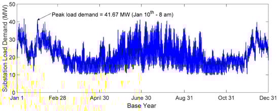 Using the available load demand data and circuit characteristics, a power flow analysis is conducted for one year. The load demand recorded at the secondary of one the substation transformers for the given year, is shown in Figure 4. Note that the recorded load demand does not take PV generation into account. The peak load demand when the existing PV systems are not generating for the given year is equal to 41.67 MVA. The peak load demand without PV generation is reported, because the PV is a variable and uncertain resource and should not be included for contingency and peak load management analysis. The PV profile and impacts will be included when studying voltage support and frequency regulation applications. In this study, for the primary application i.e., to meet N-1 contingency criteria, ES is planned for a duration of five years, starting from the base year (Year 1). A load growth rate of 1% per year is assumed to project the yearly load demand for the next five years.