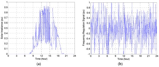 Assumptions for the analysis: (a) PV generation profile; (b) Frequency regulation signal.