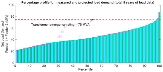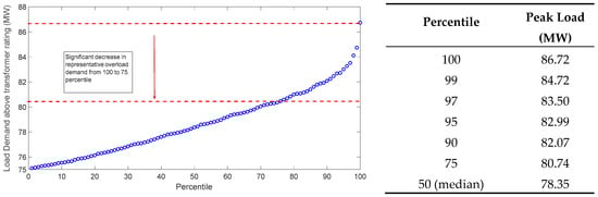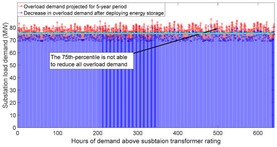 Since ES needs to be sized for the cases of substation overloading, a percentile analysis is only completed for those hours when the load demand is greater than the substation transformer rating (see Figure 8). In Figure 8, the load demand () corresponding to the -percentile denotes that, if a transformer overloading is recorded, it will be less than , with a probability. Therefore, the load demand corresponding to the 95th-percentile ( MW) indicates that the transformer overloading recorded (in five years) will be less than 82.99 MW, with a 0.95 probability. Note that the representative peak load demand decreases significantly in the 75th-percentile, to 80.74 MW.