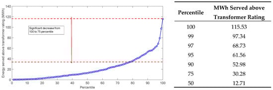 A similar analysis is conducted for the MWh served above the transformer’s emergency rating (75 MVA) over the span of five years. The percentile plot and representative percentile MWh above the transformer rating are shown in Figure 9. The 75th-percentile value for the MWh served above the transformer rating implies that, under N-1 contingency, the transformer will be serving an overload energy less than or equal to 30.28 MWh, with a probability of 0.75 in the five-year planning period.