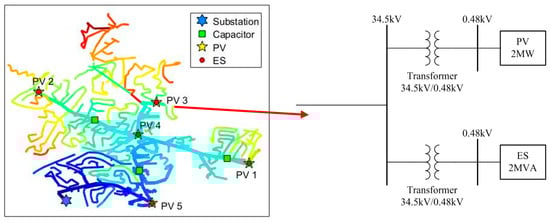 The analysis tools and test circuit used for the study are detailed in this section. We simulate the proposed ES integration framework using OpenDSS [] and MATLAB. The analysis is conducted using a test circuit adapted from a 34.5-kV EPRI test feeder [] available from an open-source for distribution system analysis.