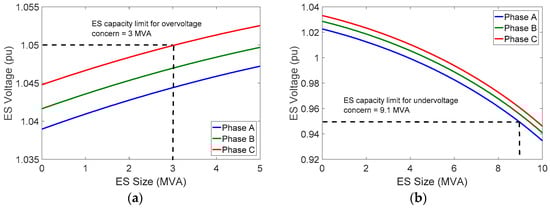 The phase voltages corresponding to the ES capacity for one of PV bus locations are shown in Figure 11. Based on the results, the overvoltage violation (V > 1.05 pu) is recorded when adding 3 MVA of ES, while the undervoltage violation (V < 0.95 pu) is recorded when adding 9.1 MVA of ES. Thus, the ES accommodation capacity for the overvoltage condition is 3 MVA, and is 9.1 MVA for the undervoltage condition. Since the integration of ES must not cause either overvoltage or undervoltage limit violations in the circuit, the overall ES capacity limit of this circuit at the selected ES location is equal to 3 MVA (the lesser value). The same analysis is repeated for each PV location, and the ES accommodation capacities are obtained (please see Table 3). Based on the analysis, an ES system with a capacity of 1.2 MW/6 MWh can be deployed at each PV location, amounting to a total capacity of 6 MW/30 MWh.
