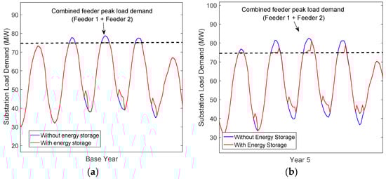 Figure 13 compares the utility of the ES system for providing N-1 contingency support for the base year (Year 1) and Year 5. For this study, the load profiles for three consecutive days overloading the transformer under an N-1 contingency event are compared with and without an ES system. For the selected days in the base year (Year 1), the energy supplied above the transformer rating is 28.2 MWh, 29.05 MWh, and 28.6 MWh. In this case, the 30 MWh energy storage is successfully able to supply the load demand above the substation transformer rating. The analysis is repeated for the same days during Year-5 (see Figure 13b). On the selected days in Year-5, the energy supplied above the transformer rating is 55.36, 77.29 and 55.80 MWh. In this case, the 30 MWh ES system is not able to successfully mitigate the overload concerns. As expected, the ES system sized for the 75th-percentile value is not able to supply the required energy demand for a few days during the planning duration.
