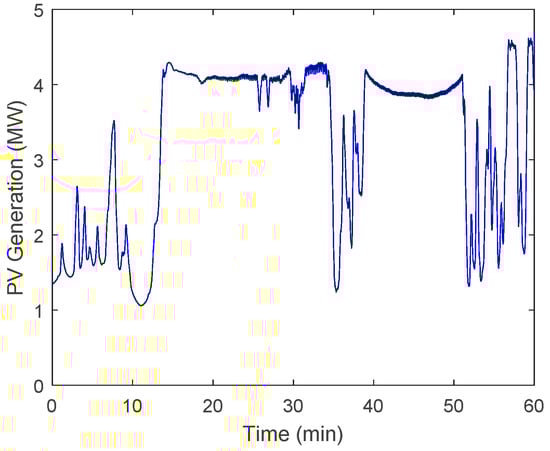 where, ∆QES is the change in the reactive power supplied or absorbed by the ES inverter, ∆PPV is the change in the PV generation power, ∆PES is the change in the ES charge or discharge power in response to the frequency regulation schedule, Rth is the real part of the short-circuit impedance at the ES location, and Xth is the imaginary part of the short-circuit impedance at the ES location. Note that ∆PPV and ∆PES are measured as the difference between the present PV and ES real power, and the 15- and 30-min moving average PV and ES real power, respectively. The PV generation follows the solar irradiance profile curve recorded on a high variability day with a one-second resolution, shown in Figure 6a.