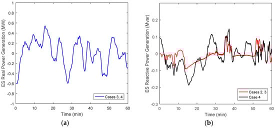On employing ES for frequency regulation in addition to voltage management due to PV variability (Case 3), the real power of ES follows the frequency regulation schedule, as presented in Figure 15a. Therefore, ES is successfully able to charge and discharge to provide a frequency regulation service. However, Figure 16 shows that the voltage profile for this case fluctuates significantly, due to the variation of ES real power. From Table 4, the voltage variability significantly increases when ES is deployed for providing frequency regulation services. Therefore, ES should be deployed to manage voltage variability due to both PV and ES real power variations.