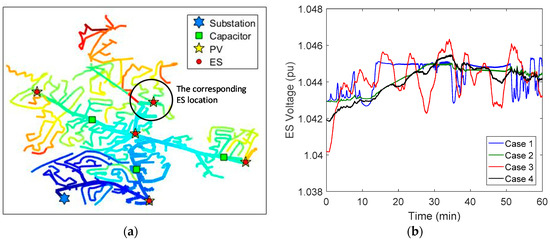 Voltage profiles at ES system location for different case studies: (a) the selected test distribution circuit and ES locations; (b) voltage profiles at one ES system location.