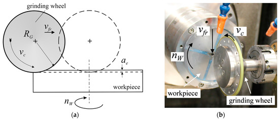 (a) Grinding kinematics—cross grinding with rotating workpiece; (b) Machine setup.
