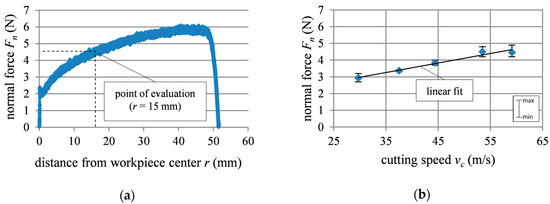 (a) Typical force curve (Fn) at vc = 62 m/s) for constant worktable speed nW; (b) Normal forces for different cutting speeds (distance from workpiece center 15 mm).