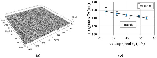 (a) White light interferometer (WLI) measurement (20× magnification): 2D-surface roughness (vc = 30 m/s, Sa = 160 nm); (b) Surface roughness Sa for different cutting speeds (distance from workpiece center 15 mm) with linear fit.