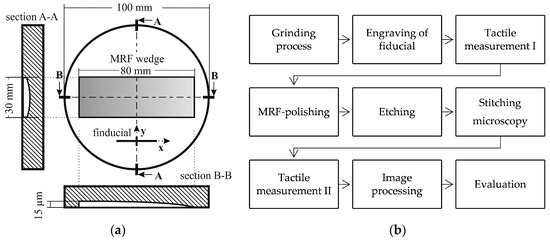 (a) Position and geometry of the magnetorheological finishing (MRF) wedge; (b) Sample processing chain.