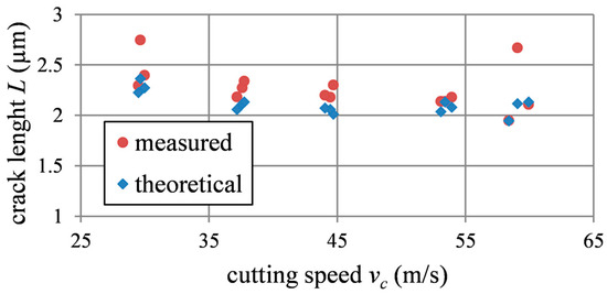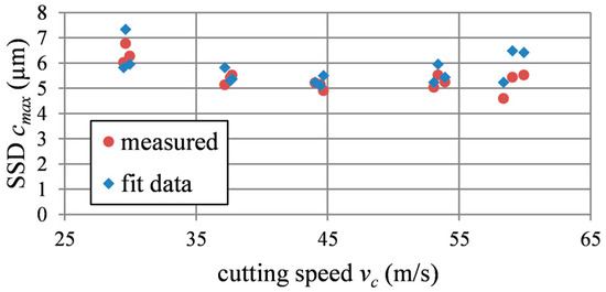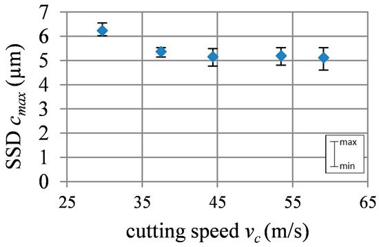 After an initial decrease in the maximum crack depth with an increasing cutting speed, a seemingly constant depth is obtained above 45 m/s (Figure 7). Besides chip thickness reduction, higher spindle speeds and resulting higher cutting speeds lead to stronger vibrations [16]. This may explain why there is no further improvement of the maximum SSD-depth at cutting speeds higher than 45 m/s. The single-grain load, as the main cause for SSD, seems to be confirmed. In theory, the influence of the material removal rate and thus process parameters such as cutting speed, feed rate and infeed can be easily assessed. In practice, however, the stochastic nature of the grinding wheel as well as other influences such as limited machine rigidity have influence on the maximum crack depth.