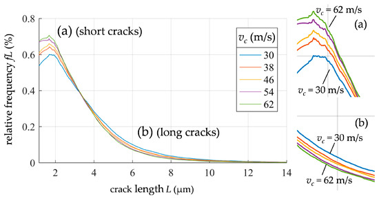 On average, 150,000 cracks were evaluated for each sample with this method. Figure 9 shows the ratio of the number of cracks of different lengths to the total crack number (relative frequency) for different cutting speeds.