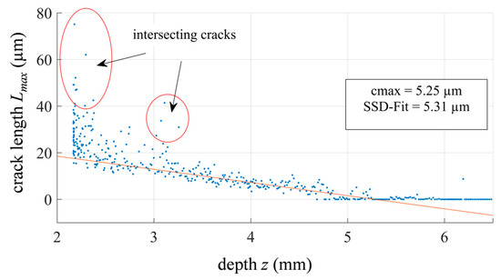 As stated above, the maximum crack depth cmax results from one particular or only a few grains. It is thereby subject to a certain variation by the nature of the microstructure of the grinding wheel and the grinding process. Both, crack depth and crack length, depend directly on the grain load. The maximum crack depth cmax should therefore also lead to the maximum crack length Lmax. Within the experiments Lmax shows a linear decay with depth. Figure 11 shows Lmax at intervals of 50 µm along the polished wedge. To avoid the influence of outliers by intersecting cracks on the linear fit, the double median crack length LMdn is set as cut-off criteria.