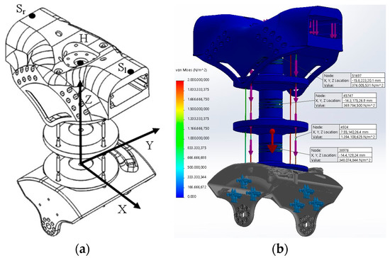 Mechanical design: (a) CAD model with characteristic points, (b) FEM computation results.