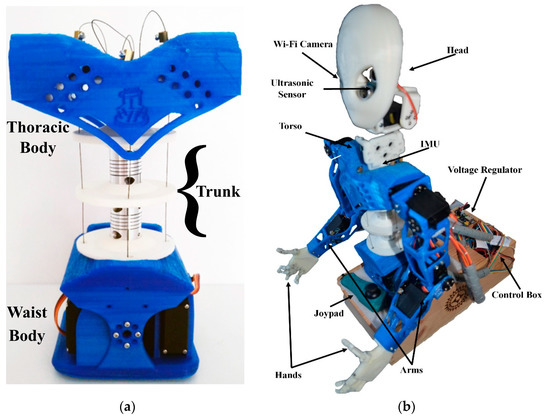 A prototype was built at LARM in Cassino by looking for a low-cost solution using 3D-printing manufacturing for structural parts and commercial components for actuators, sensors, and connections. The prototype is shown in Figure 4. The prototype of the torso alone in Figure 4a can fit into a box with dimensions of 154.00 mm × 113.80 mm × 261.34 mm. The waist is thicker than the shoulder body; it is sized within the dimensions of 116.00 mm × 113.80 mm × 105.19 mm. The trunk, consisting of the torso part between the thoracic and waits parts, is sized within the dimensions of 154.00 mm × 94.50 mm × 81.90 mm. The weight of only the torso structure is 1.2 kg, including all its components and systems. It has also been assembled in a humanoid version, with arms and head, as shown in Figure 4b. With the fully extended arms, it can fit in a box with dimensions of 307.00 mm × 113.80 mm × 538.60 mm, with a weight of 1.6 kg. The humanoid assembly is characterized by anthropomorphic arms and a head that is equipped with sensors for vision, the purpose of which is to verify its practical feasibility in humanoid tasks.