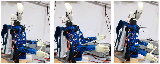 The humanoid assembly with the arms was tested in terms of motion ranges and payload capability. Tests were run by in lifting a payload using the arms with a compensation motion performed by the torso. Tests were carried out with the humanoid assembly of Figure 8 both to check the feasibility of the torso for a humanoid implementation and to investigate the effects of the arms and head structure on the torso performance. In Figure 8, a sequence of test configurations is shown for the case of successful payload lifting by the arms with a small torso bending for a payload of 0.560 kg. The payload was reduced with respect to the previous case for torso capability, since the arms imposed a reduction of payload capability due to their mechanical design. Results of the test are shown in Figure 9 and Figure 10.