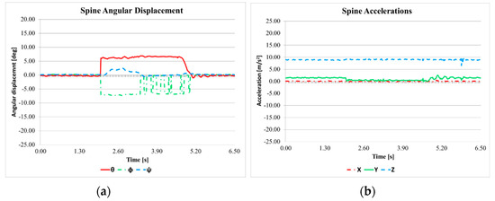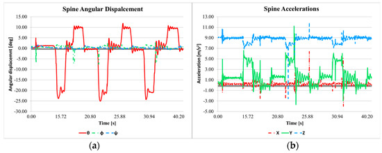 In addition, the angular displacement exhibits a relationship with the linear acceleration, as shown in in Figure 6b, both of which are measured for the point at the top of the spine. When the torso bends forward from 14.58 s up to 16.70 s, the IMU senses the two components of the acceleration along the Y-axis and Z-axis. The measured acceleration along the Y-axis has a range between −4.00 and 6.39 m/s2. The acceleration component along the Z-axis with a range between −2.55 and 9.81 m/s2. The Z-axis has a zero offset of 9.81 that is due to the acceleration of gravity. The acceleration along the X-axis is negligible. Vibration noise is detected as coming both from the motor motion and the prototype mechanical design.